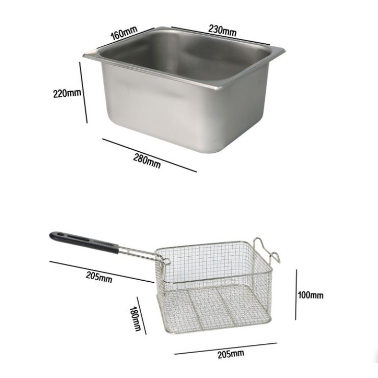 - Bếp chiên điện 1 thùng 1 giỏ là dòng bếp đơn có một thùng chứa dầu và 1 giỏ đựng thực phẩm khi chiên, rán.