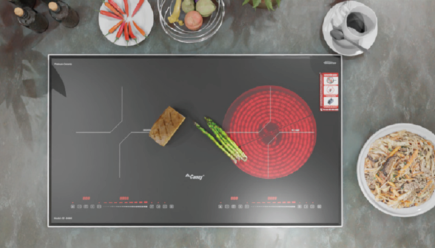 Bếp điện từ kết hợp: 01 điện + 02 từ Mặt kính Crytal siêu bền, chịu lực chịu sốc nhiệt Đầu đốt EGO Made in Germany Chức năng Booster cực nhanh với bếp từ 10