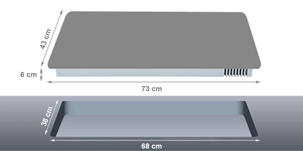 - Kích thước mặt kính: 730 x 430 mm