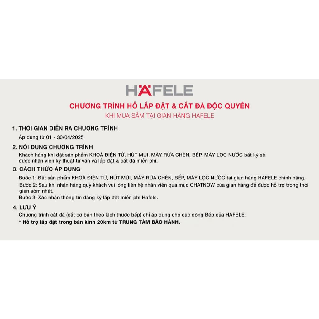 - Cách thức áp dụng Bước 1: Mua sản phẩm KHOÁ ĐIỆN TỬ, MÁY HÚT MÙI, MÁY RỬA CHÉN, BẾP tại gian hàng Hafele chính hãng. Bước 2: Sau khi nhận hàng quý khách vui lòng liên hệ nhân viên qua mục ChatNow của gian hàng để được hỗ trợ trong thời gian sớm nhất. Bước 3: Xác nhận thông tin đăng ký lắp đặt miễn phí từ Hafele. CHẾ ĐỘ BẢO HÀNH Để kích hoạt chế độ bảo hành, khách hàng vui lòng dùng ứng dụng quét QR code trên điện thoại hoặc mở ứng dụng Hafele và quét để kích hoạt bảo hành. THÔNG TIN THƯƠNG HIỆU Được thành lập từ năm 1923 tại thành phố Nagold Đức, với thành công trong lĩnh vực phụ kiện nội thất, phụ kiện công trình cao cấp và hệ thống khóa điện tử tiên tiến. HAFELE ngày nay là một trong những công ty cung cấp công nghệ phụ kiện lớn nhất trên thế giới với 37 công ty con và dòng sản phẩm đa dạng hiện diện tại hơn 150 quốc gia. Nền tảng với hơn 90 năm kinh nghiệm và không ngừng đổi mới, sáng tạo đã giúp HAFELE phát triển ngày càng mạnh mẽ và trở thành 1 doanh nghiệp hàng đầu mang lại các giải pháp tối ưu cho nhà ở và công trình.