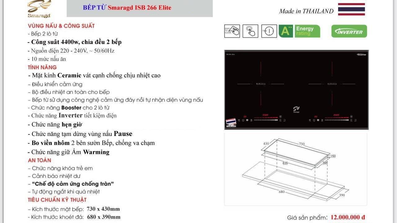 Mua tại TiktokBếp từ đôi Smaragd ISB-266 Elite công nghệ Inverter, Booster chuẩn Đức xuất xứ Thái Lan Tên sản phẩm: Bếp từ đôi ISB-266 Elite - Nhập khẩu Thương hiệu: Smaragd Đức Xuất xứ: Thái Lan Điện áp: 220-240V / 50-60 Hz Công suất: 4400W 02 vùng nấu: 02 từ Kích thước mặt: 730 x 430 mm Kích thước âm: 680 x 390 mm Trọng lượng: bếp 8.05kg, đóng hộp 9.45kg Kích thước hộp: 83 x 50 x 13cm Chất liệu: Mặt kính Ceramic (gốm thủy tinh), bo viền nhôm 2 bên Chức năng: 10 mức nấu ăn, khóa trẻ em, Booster cho 2 lò từ, Inverter tiết kiệm điện, hẹn giờ, tạm dừng vùng nấu Pause Điều khiển: cảm ứng trượt Slider Control Bảo hành 2 năm chính hãng
