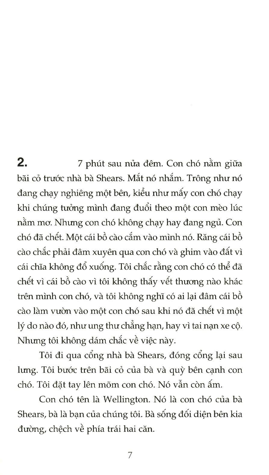Nếu bạn thuộc tất cả những số nguyên tố cho tới 7057, biết tất cả các nước cùng thủ đô của chúng và giết thời giờ bằng cách giải phương trình bậc hai không cần giấy bút, rất có thể người ta sẽ gọi bạn là thần đồng. Nhưng nếu bạn lại còn không hiểu được xúc cảm của người khác mà chỉ thân thiết với động vật, chỉ thấy an toàn khi đi trên một đường nhất định, và hễ bối rối thì chúi đầu xuống đất mà rên rỉ hay đập phá đồ đạc, như Christopher John Francis Boone, thì chắc chắn người ta sẽ nhìn bạn bằng con mắt đặc biệt. Nhất là khi người ta bắt gặp bạn, lúc nửa đêm, ôm con chó bị giết chết trong sân nhà hàng xóm, ngay cạnh ngôi nhà của bạn, đã hai năm nay chỉ còn có bố.