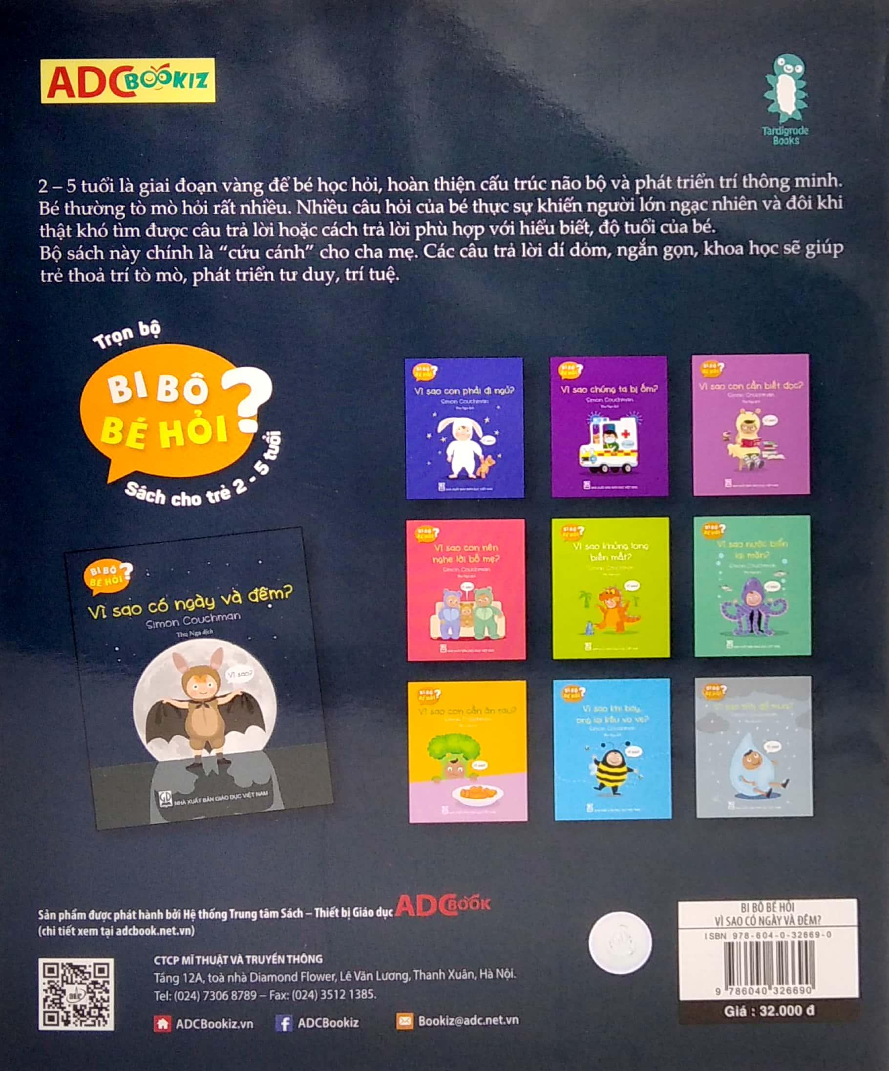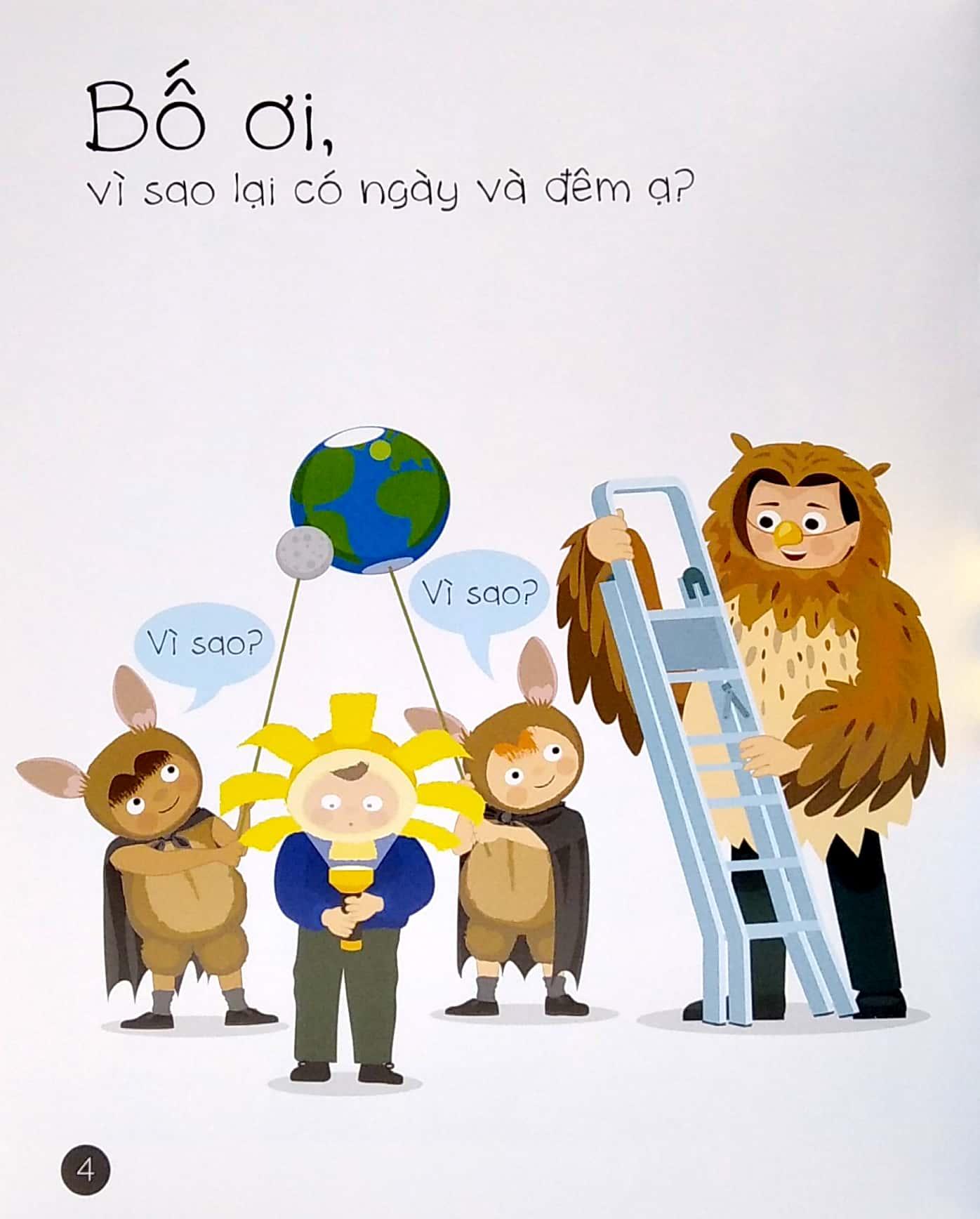 Vì sao có ngày và đêm?: Cuốn sách là lời giải đáp dễ hiểu, thú vị cho bé về nguyên nhân có ngày và đêm: do Trái Đất quay quanh trục và quay quanh Mặt Trời. Ngoài ra, bé còn biết thêm các kiến thức về: độ lớn của Mặt Trời, Mặt Trăng, Trái Đất; nguyên nhân ngày dài hơn đêm vào mùa hè, đêm thường lạnh hơn ban ngày, một số loài động vật chỉ hoạt động về đê Mục đố vui cuối sách giúp bé nâng cao khả năng quan sát.