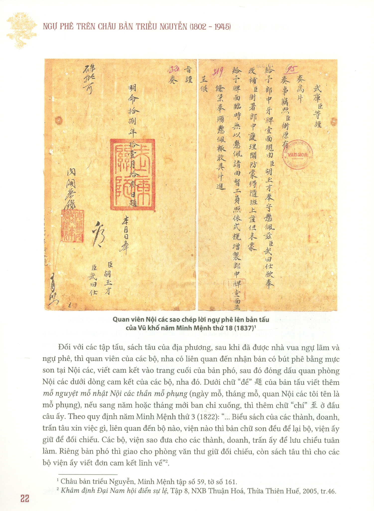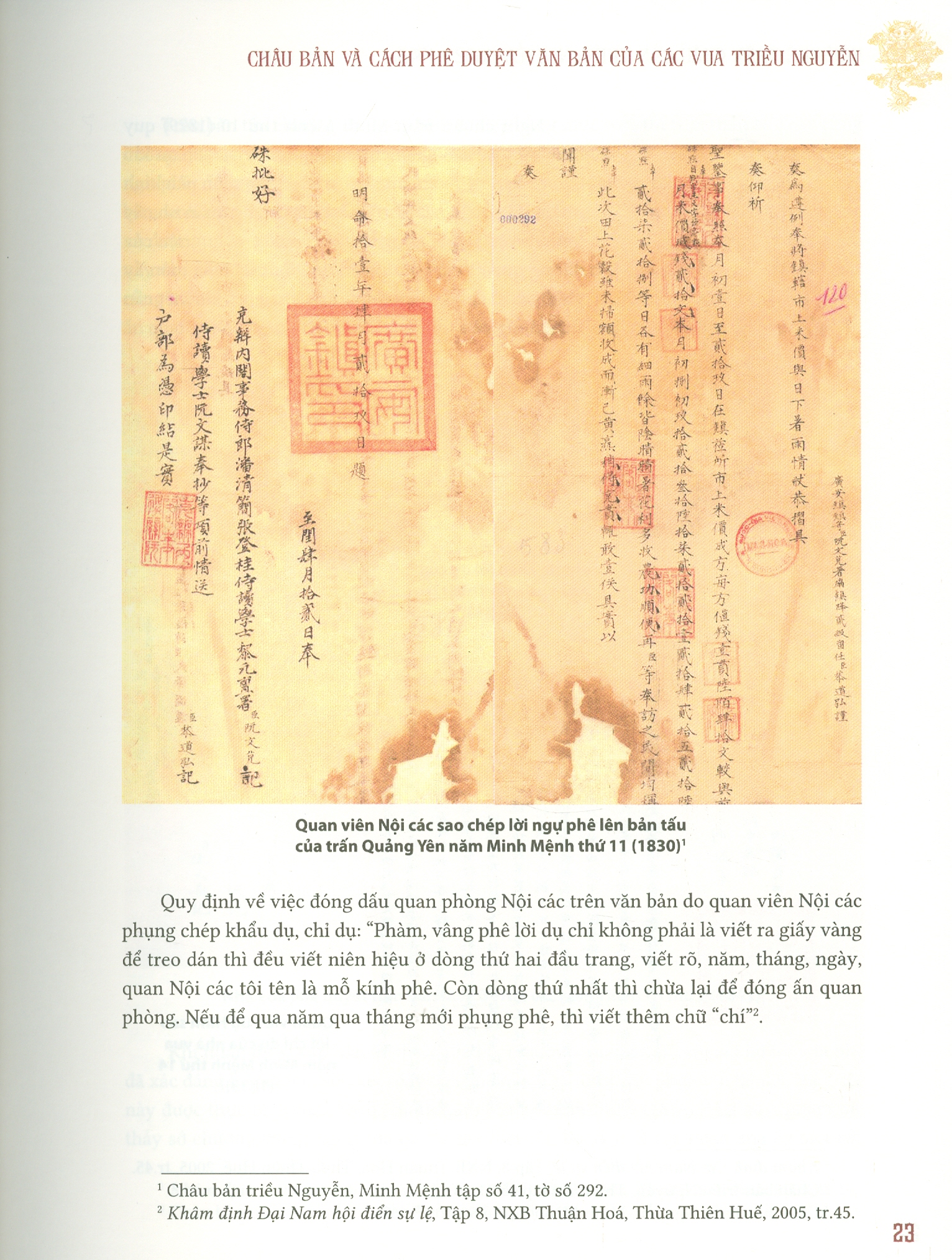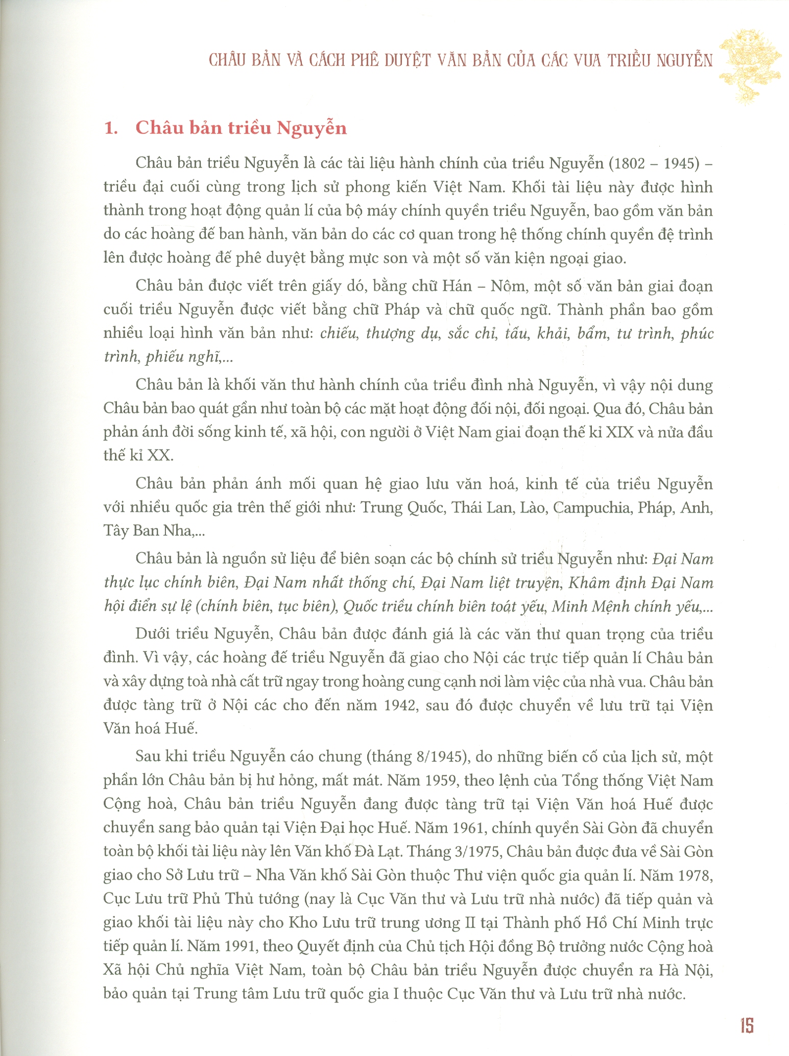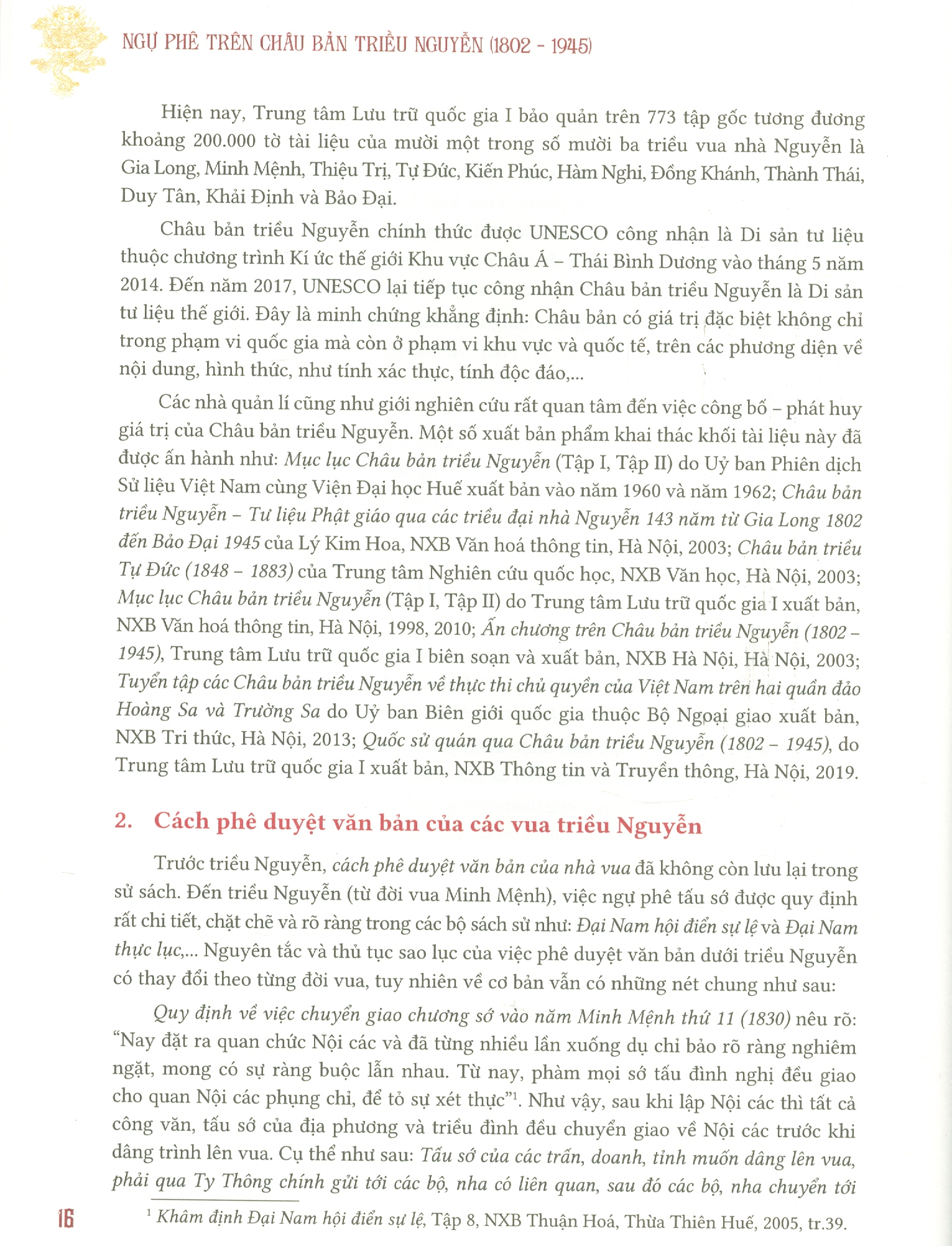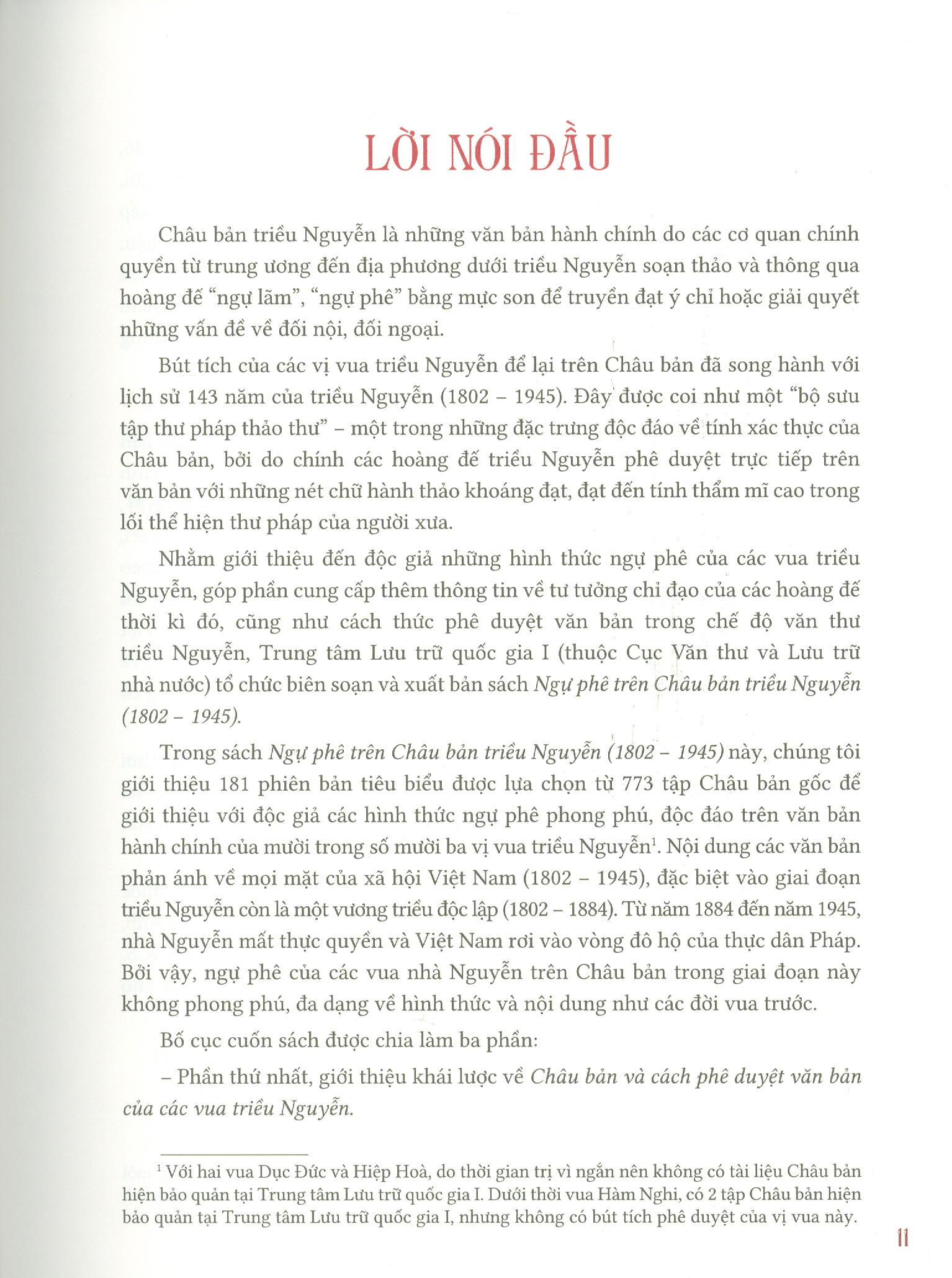– Phần thứ nhất, giới thiệu khái lược về Châu bản và cách phê duyệt văn bản của các vua triều Nguyễn.