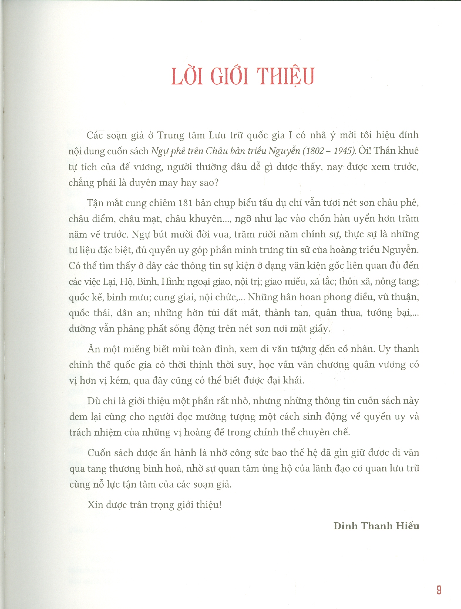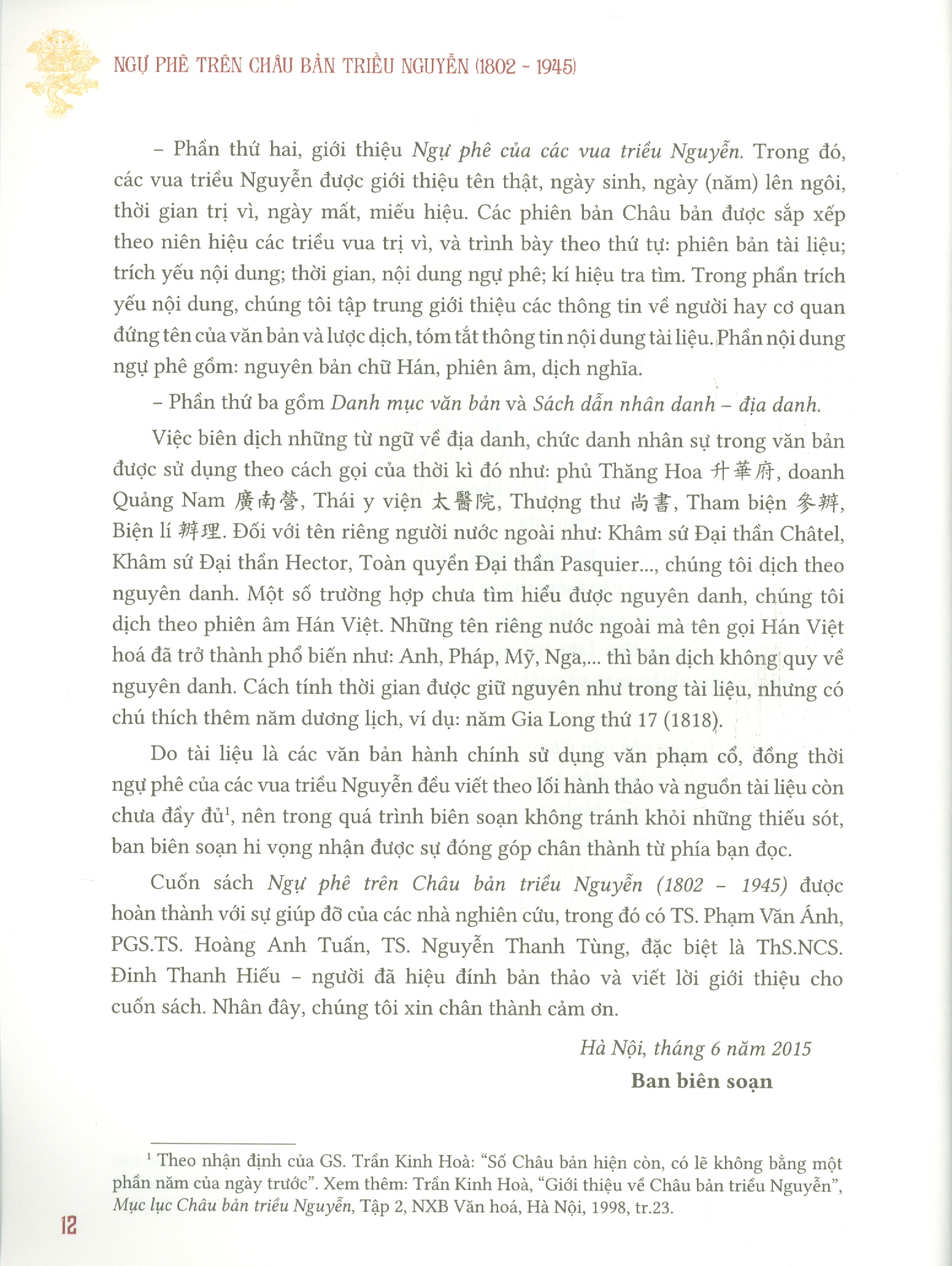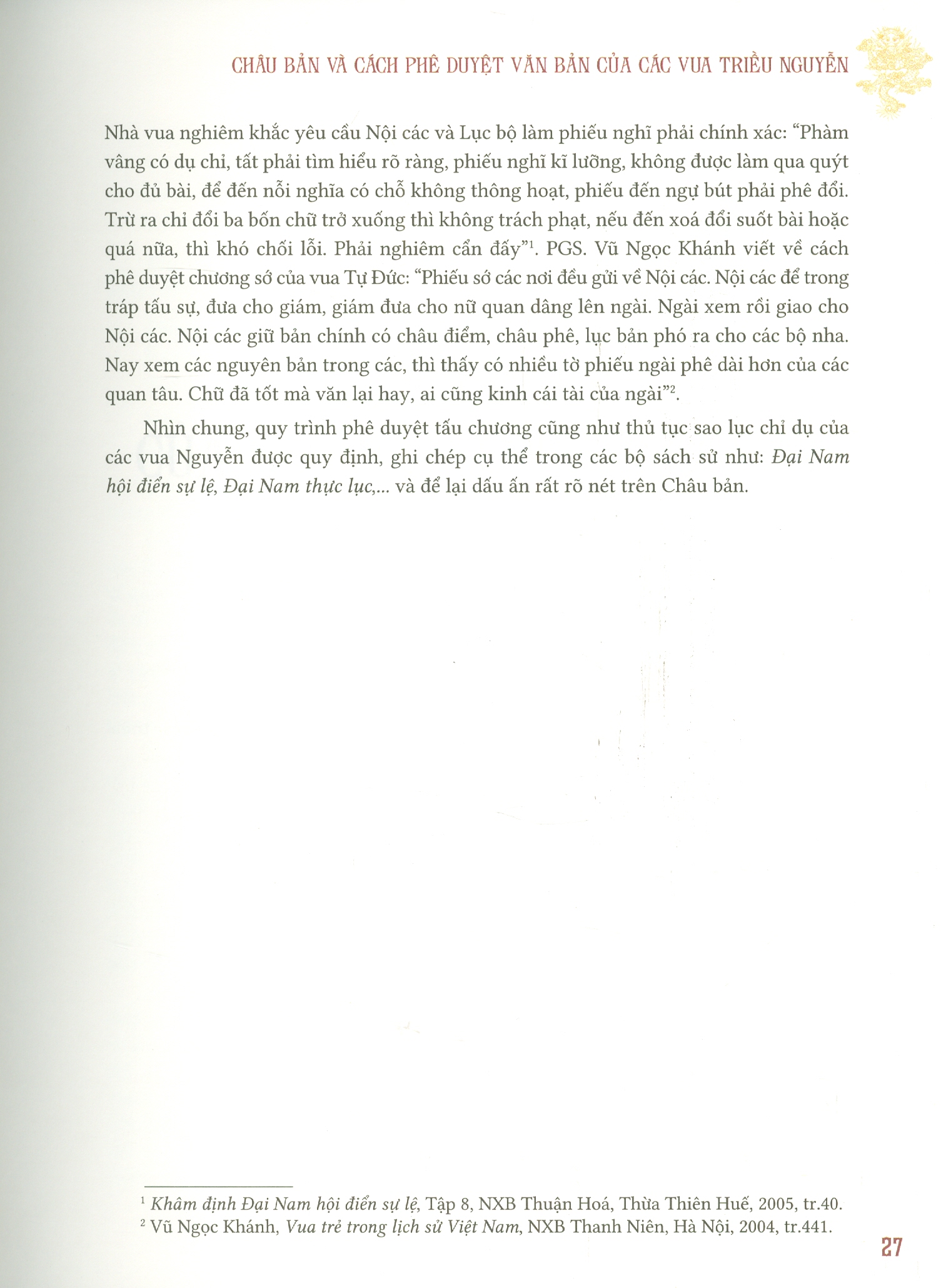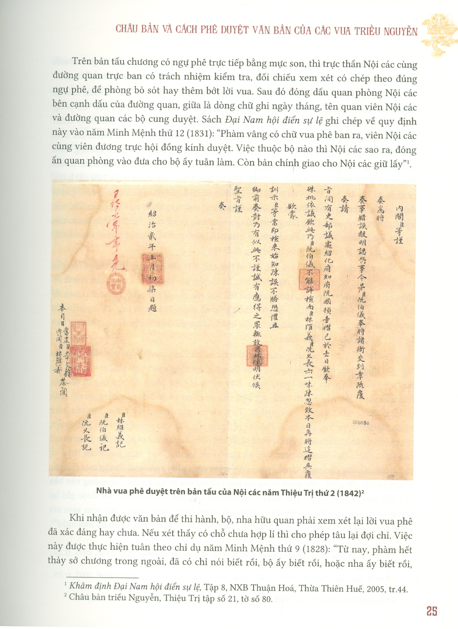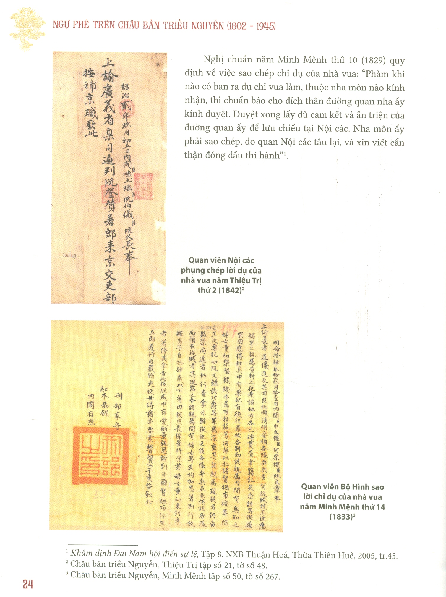 – Phần thứ nhất, giới thiệu khái lược về Châu bản và cách phê duyệt văn bản của các vua triều Nguyễn.