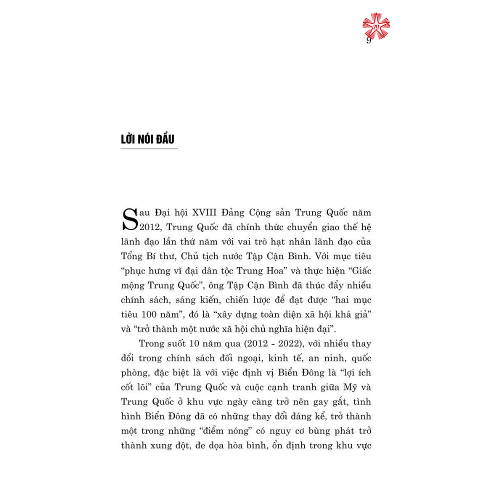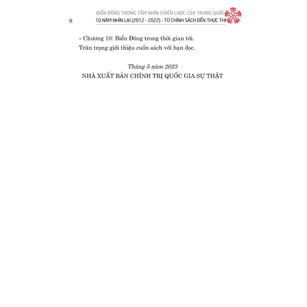 Để giúp độc giả có được cách nhìn khái quát, toàn diện về vai trò, vị trí của Biển Đông trong các mục tiêu chiến lược lớn của Trung Quốc trong suốt 10 năm (2012 - 2022), kể từ Đại hội XVIII dưới sự cầm quyền của thế hệ lãnh đạo thứ năm của Đảng Cộng sản Trung Quốc mà hạt nhân là ông Tổng Bí thư, Chủ tịch nước Tập Cận Bình đến nay, Nhà xuất bản Chính trị quốc gia Sự thật xuất bản cuốn sách Biển Đông trong tầm nhìn chiến lược của Trung Quốc: 10 năm nhìn lại (2012 - 2022) - Từ chính sách đến thực thi do TS. Bùi Thị Thu Hiền - Giám đốc Trung tâm Nghiên cứu Biển Đông, Viện Nghiên cứu Trung Quốc, Viện Hàn lâm Khoa học xã hội Việt Nam làm chủ biên.