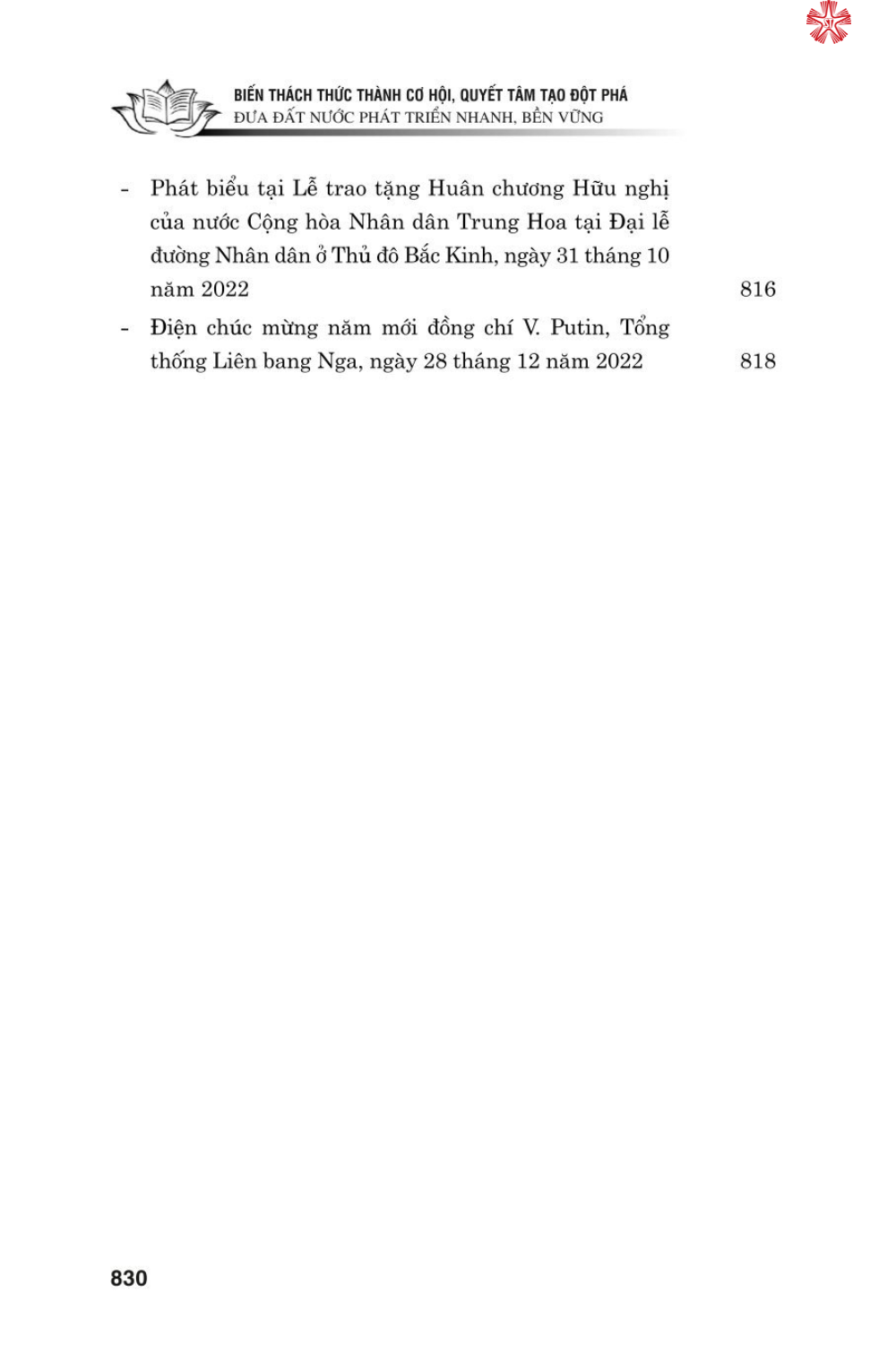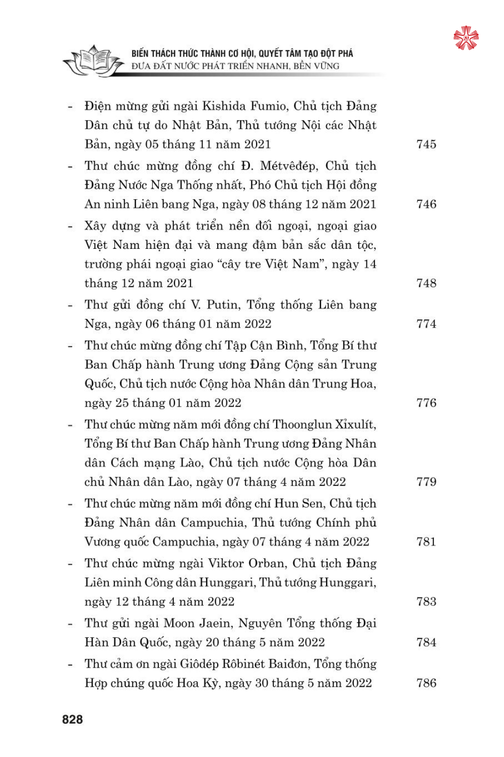 Cuốn sách “Biến thách thức thành cơ hội, quyết tâm tạo đột phá đưa đất nước phát triển nhanh, bền vững” tuyển chọn các bài phát biểu, bài viết, bài trả lời phỏng vấn, thư, điệ của đồng chí Tổng Bí thư Nguyễn Phú Trọng từ tháng 4/2021 đến tháng 12/2022.