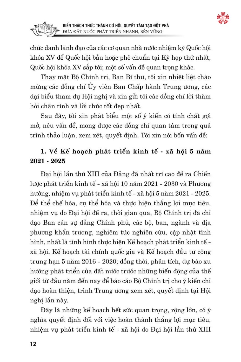 Cuốn sách “Biến thách thức thành cơ hội, quyết tâm tạo đột phá đưa đất nước phát triển nhanh, bền vững” tuyển chọn các bài phát biểu, bài viết, bài trả lời phỏng vấn, thư,