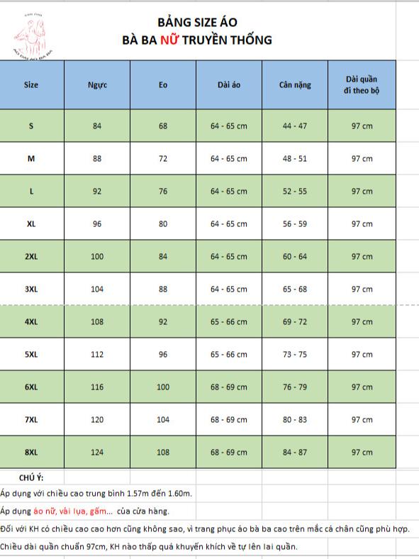 BẢNG SIZE ÁO BÀ BA NỮ TRUYỀN THỐNG Size Ngực Eo Dài áo Cân nặng "Dài quần đi theo bộ" 6XL 106 100 64 - 65 cm 76 - 78 95 cm 7XL 112 104 64 - 65 cm 79 - 81 95 cm 8XL 116 108 64 - 65 cm 82 - 85 95 cm CHÚ Ý: Áp dụng với chiều cao trung bình 1.57m đến 1.60m. Áp dụng áo nữ, vải lụa, gấm... của cửa hàng. Đối với KH có chiều cao cao hơn cũng không sao, vì trang phục áo bà ba cao trên mắc cá chân cũng phù hợp. Chiều dài quần chuẩn 95cm, KH nào thấp quá khuyến khích về tự lên lai quần.