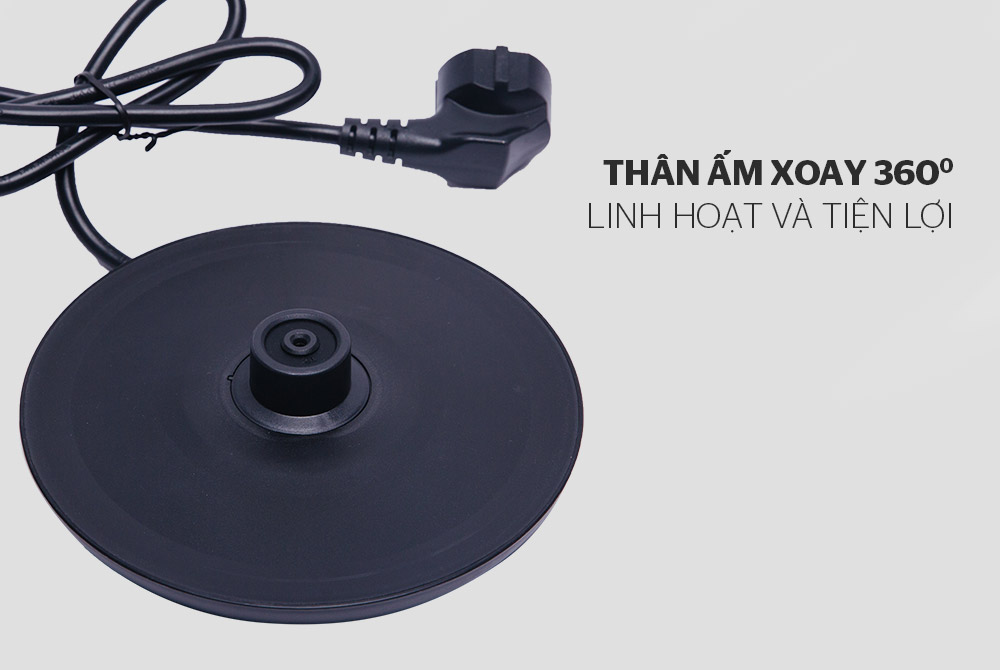 Đế tiếp điện được thiết kế độc lập, tách rời khỏi thân ấm, giúp việc đổ nước – tiếp nước dễ dàng, linh hoạt. Ấm có thể xoay 360 độ trên đế tiếp điện, người dùng có thể đặt ấm lên hay nhấc ấm ra khỏi đế ở bất cứ góc nào mà không phải lo lắng đến vấn đề phải đặt sao cho khớp.