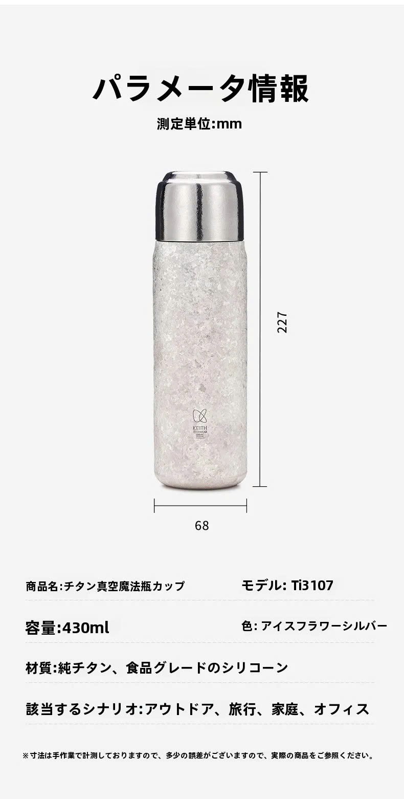 THÔNG TIN SẢN PHẨM: - Thương hiệu: Keith Titanium - Xuất xứ: Trung Quốc - Chất liệu: Titanium - Kích thước: 68 x 227mm - Trọng lượng: 221g - Dung tích: 430ml - Cách nhiệt