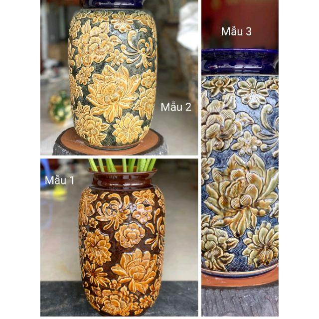 Bình hoa Bát Tràng cao cấp, hàng chuẩn loại 1 với kiểu dáng đùi ếch (phần đáy bình nhỏ, phình to ở phần trên và miệng bình) phối với họa tiết hoa đắp nổi cầu