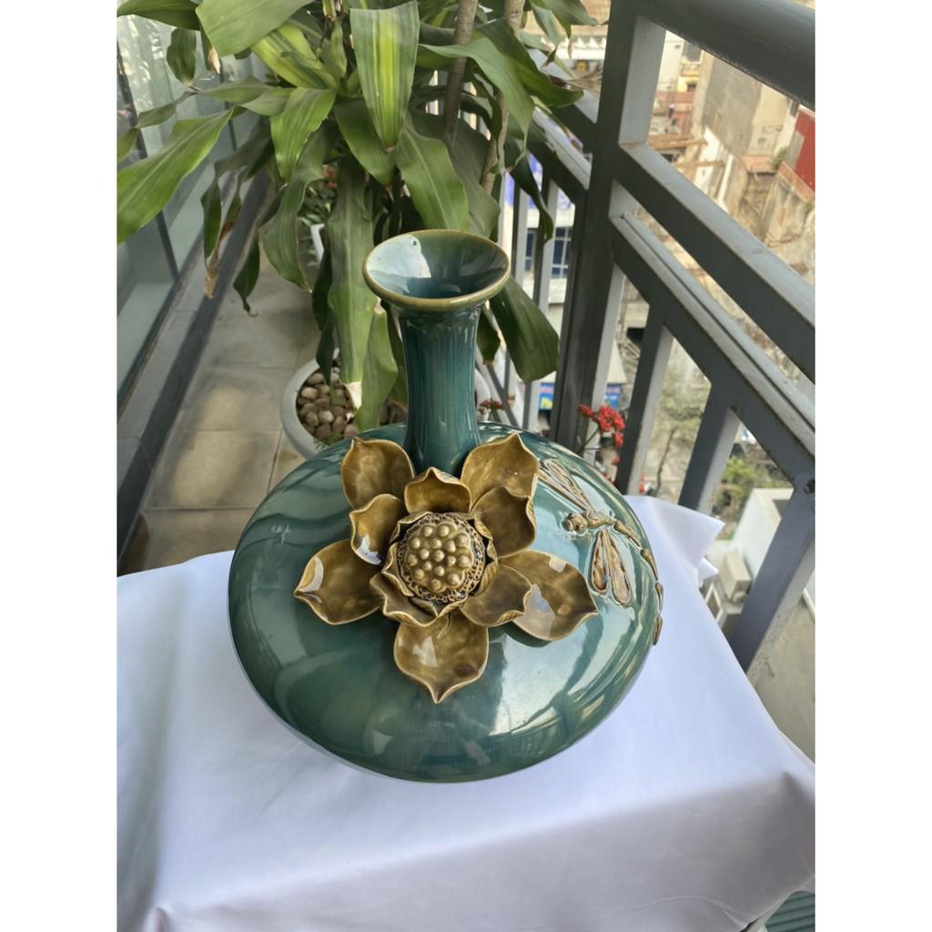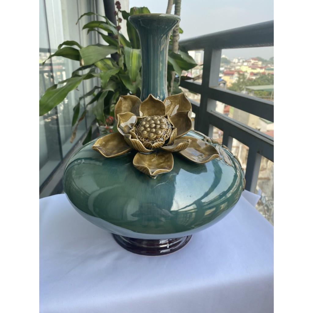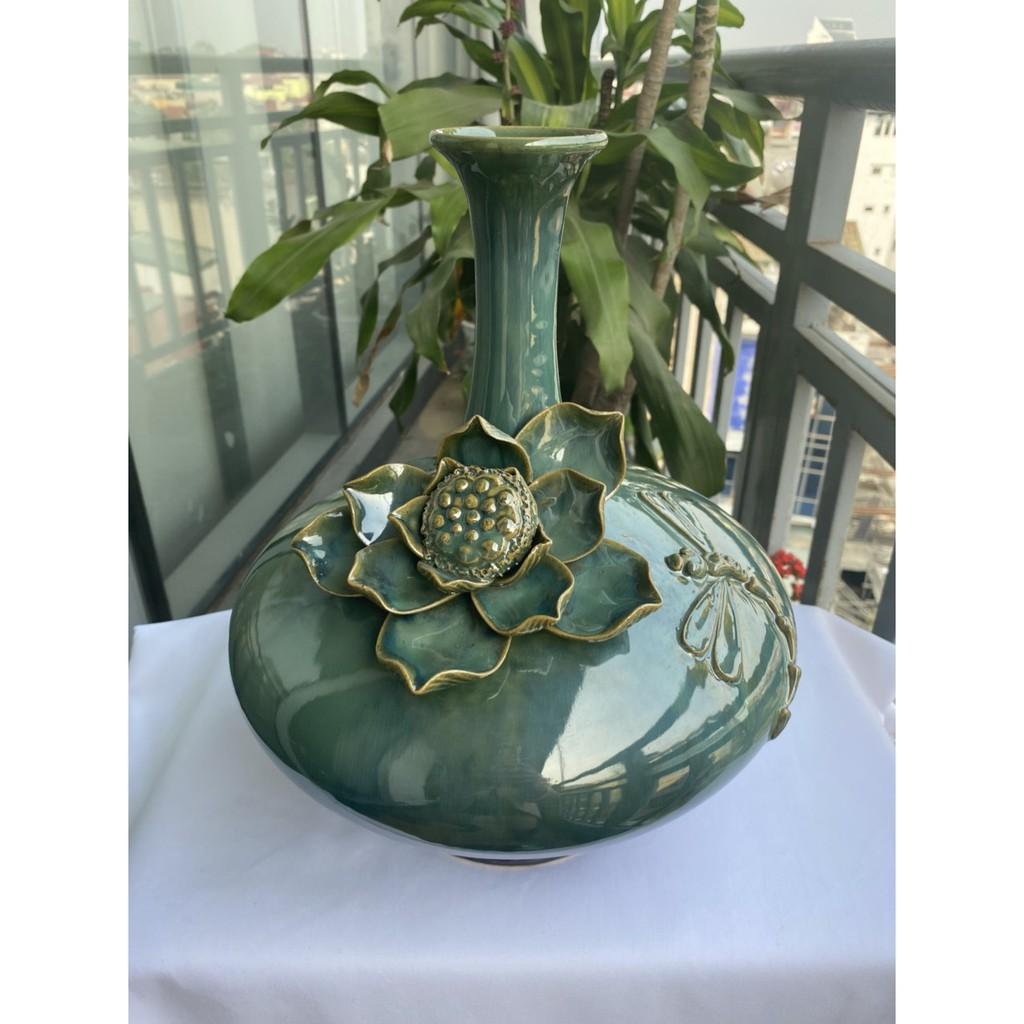 Mua tại TiktokBình hút tài lộc sứ Bát Tràng cao cấp, dáng cổ cao, bụng dẹt, men xanh hỏa biến với nước men căng bóng, sáng mịn cùng với họa tiết hoa sen đắp nổi cầu kỳ,