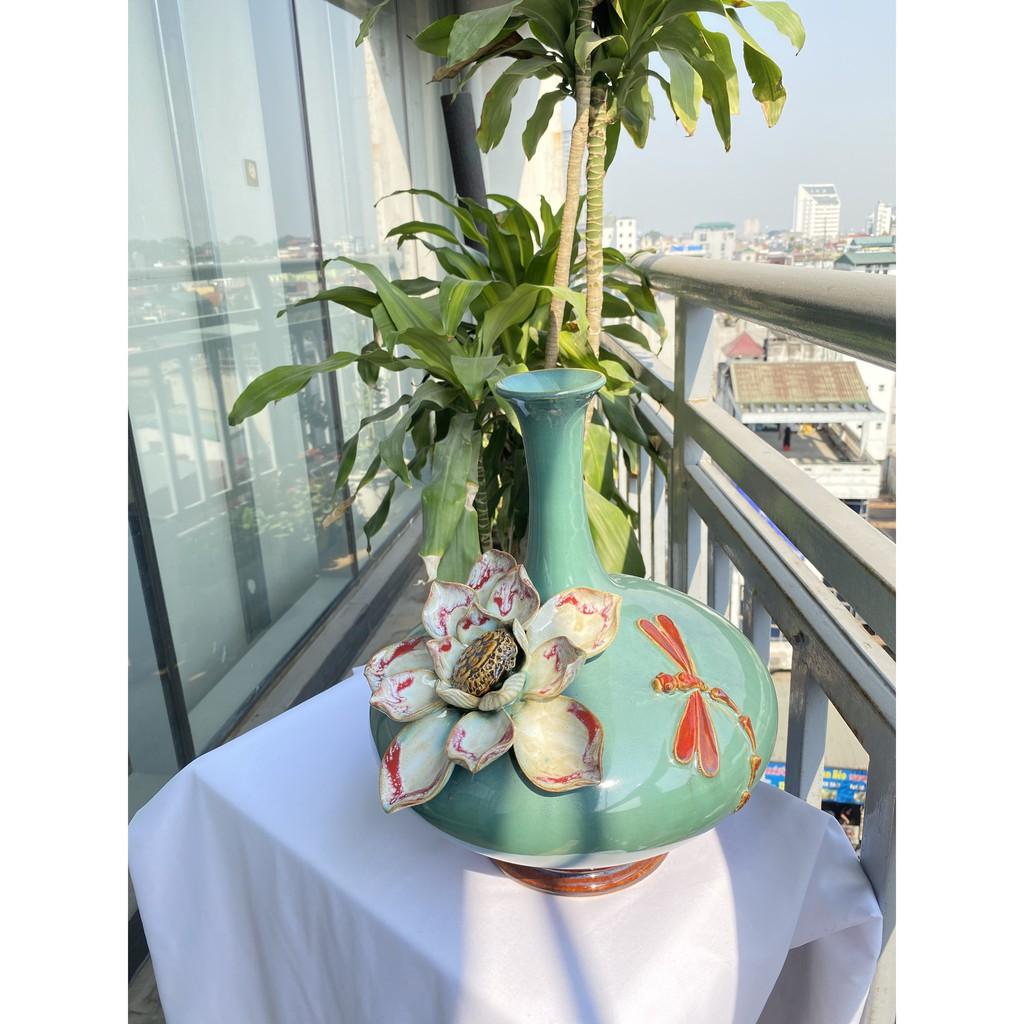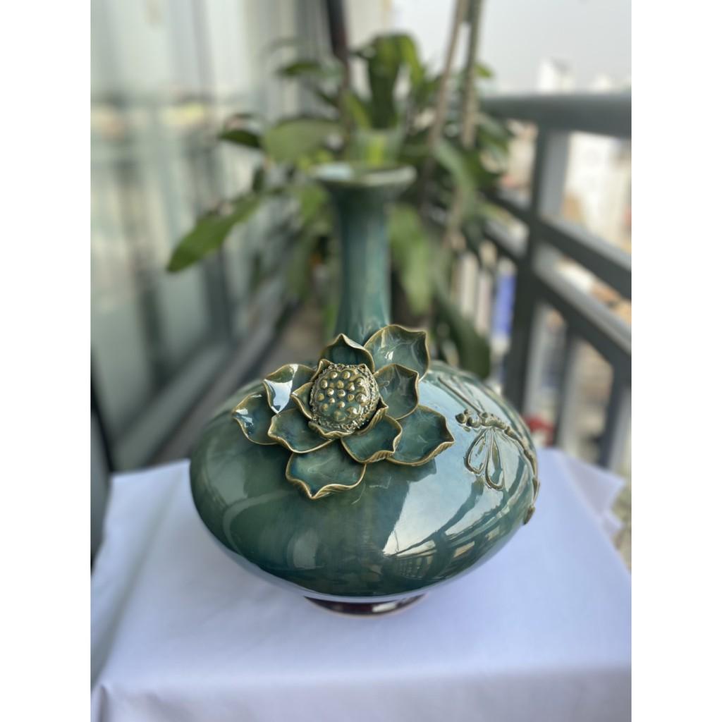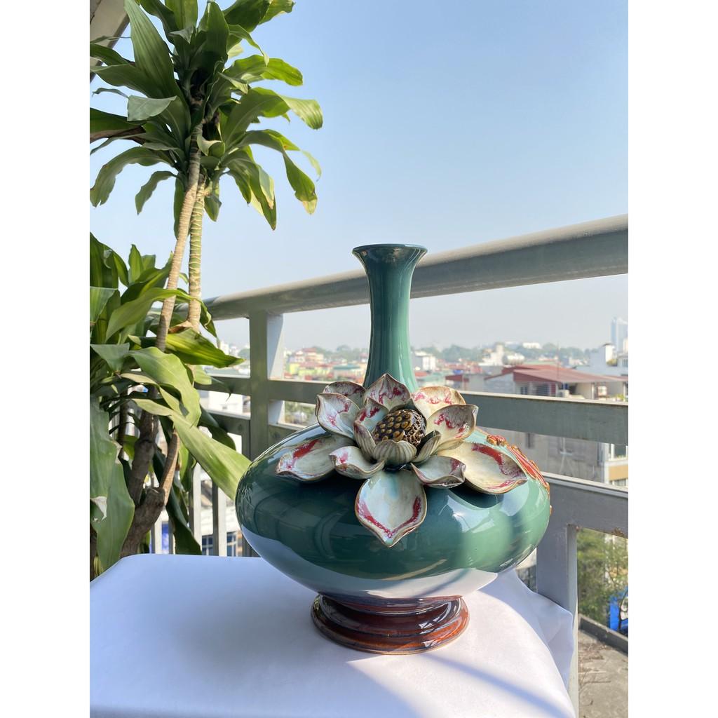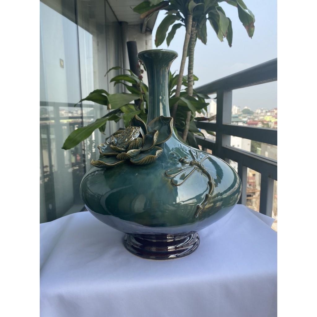Mua tại TiktokBình hút tài lộc sứ Bát Tràng cao cấp, dáng cổ cao, bụng dẹt, men xanh hỏa biến với nước men căng bóng, sáng mịn cùng với họa tiết hoa sen đắp nổi cầu kỳ,