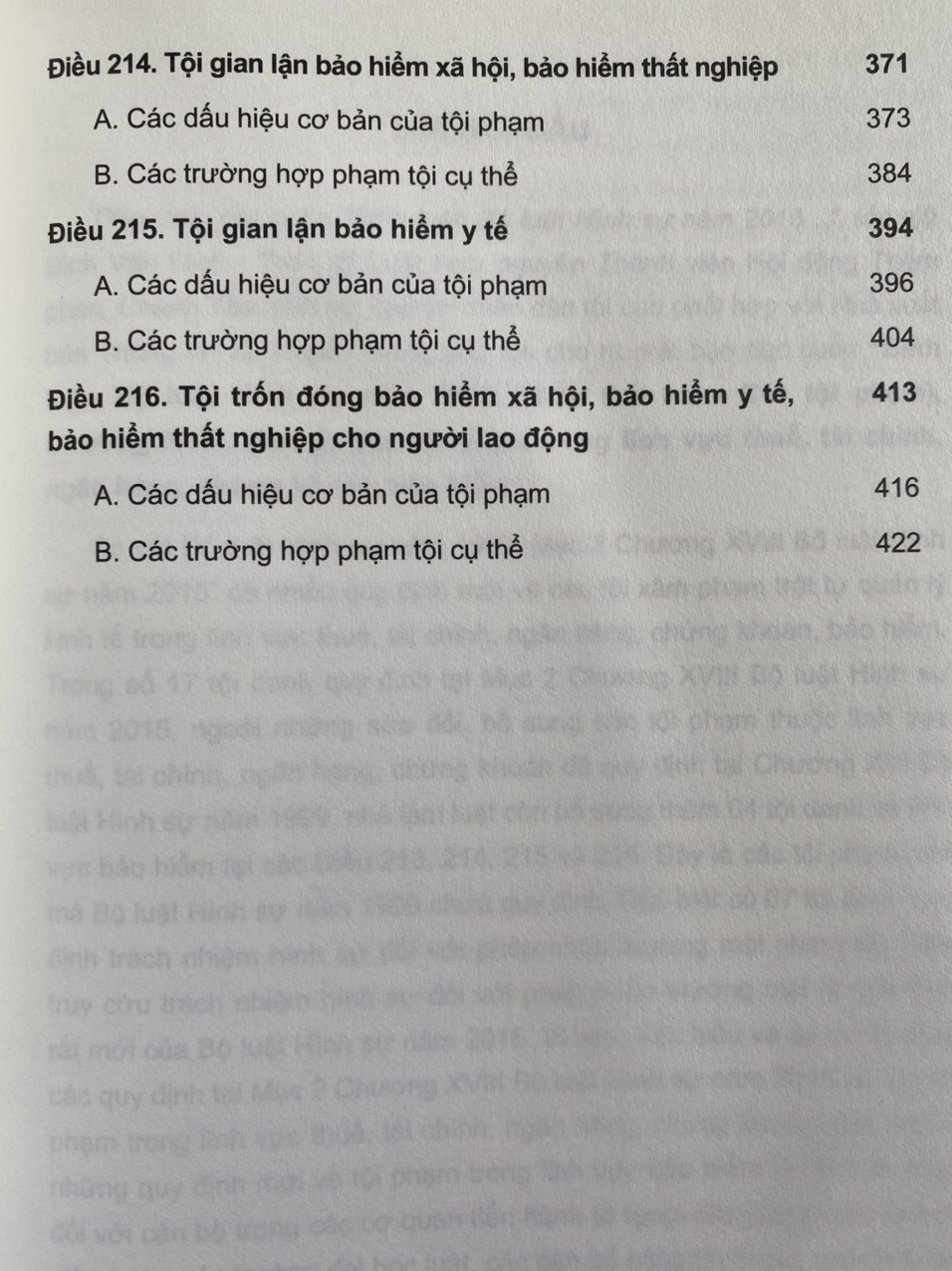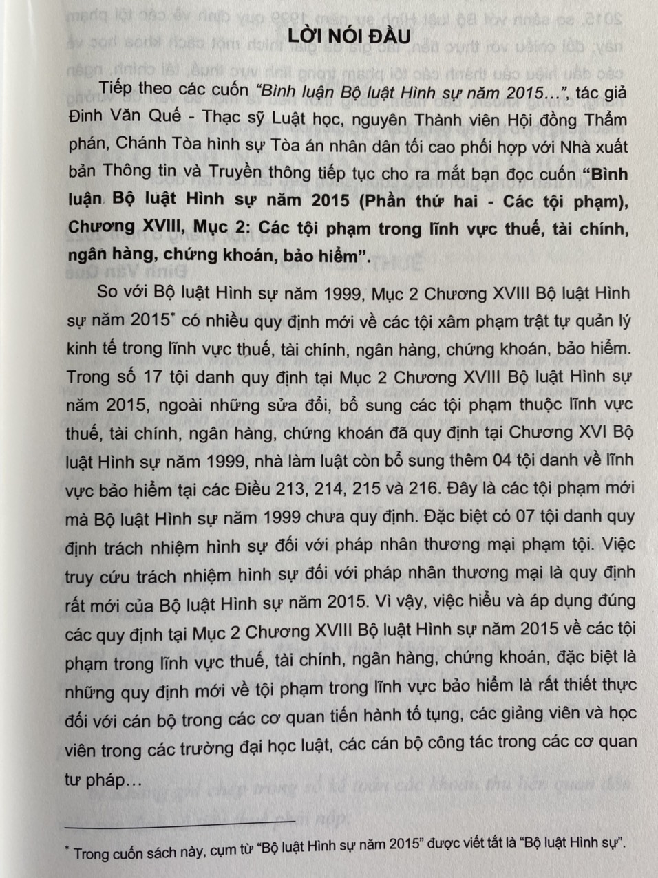 So với Bộ luật Hình sự năm 1999, Mục 2 Chương XVIII Bộ luật Hình sự năm 2015 có nhiều quy định mới về các tội trật tự quản lý kinh tế trong lĩnh vực thuế, tài chính, ngân hàng, chứng khoán, bảo hiểm. Trong số 17 tội danh quy định tại Mục 2 Chương XVIII Bộ luật Hình sự năm 2015, ngoài những sửa đổi, bổ sung các tội phạm thuộc lĩnh vực thuế, tài chính, ngân hàng, chứng khoán đã quy định tại Chương XVI Bộ luật Hình sự năm 1999, nhà làm luật còn bổ sung thêm 04 tội danh về lĩnh vực bảo hiểm tại các Điều 213, 214, 215 và 216. Đây là các tội phạm mới mà Bộ luật Hình sự năm 1999 chưa quy định. Đặc biệt có 07 tội danh quy định trách nhiệm hình sự đối với pháp nhân thương mại phạm tội. Việc truy cứu trách nhiệm hình sự đối với pháp nhân thương mại là quy định rất mới của Bộ luật Hình sự năm 2015. Vì vậy, việc hiểu và áp dụng đúng các quy định tại Mục 2 Chương XVIII Bộ luật Hình sự năm 2015 về các tội phạm trong lĩnh vực thuế, tài chính, ngân hàng, chứng khoán, đặc biệt là những quy định mới về tội phạm trong lĩnh vực bảo hiểm là rất thiết thực đối với cán bộ trong các cơ quan tiến hành tố tụng, các giảng viên và học viên trong các trường đại học luật, các cán bộ công tác trong các cơ quan tư pháp…