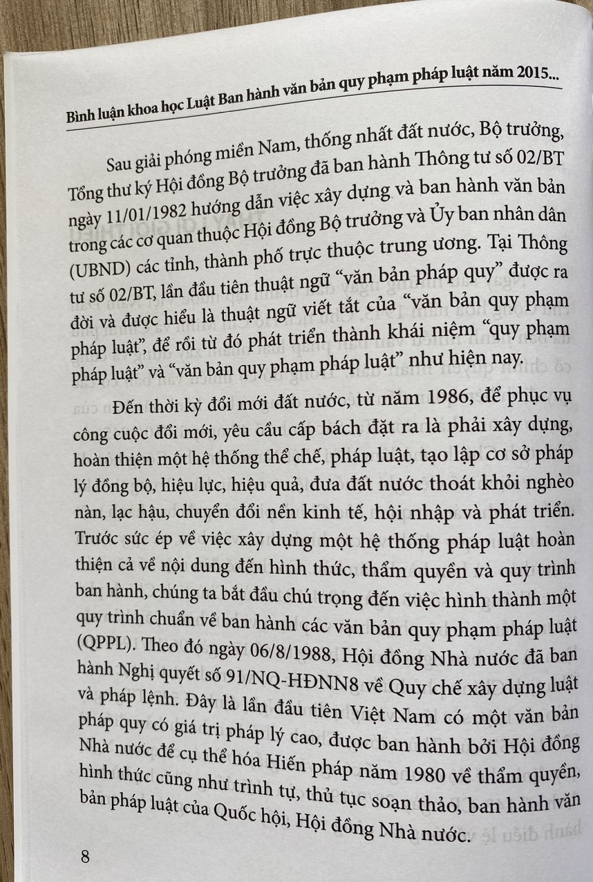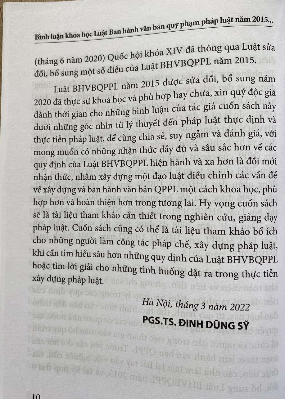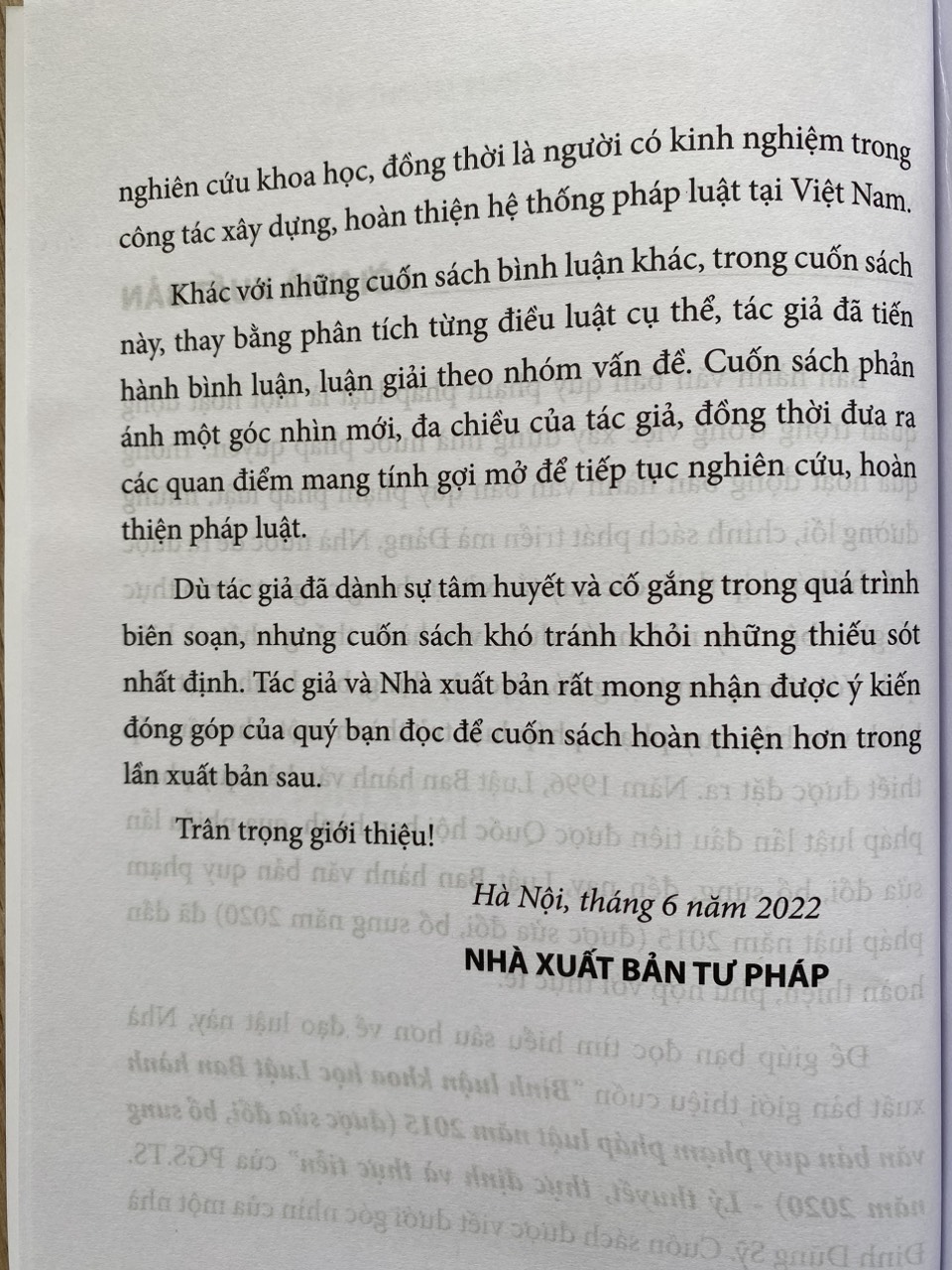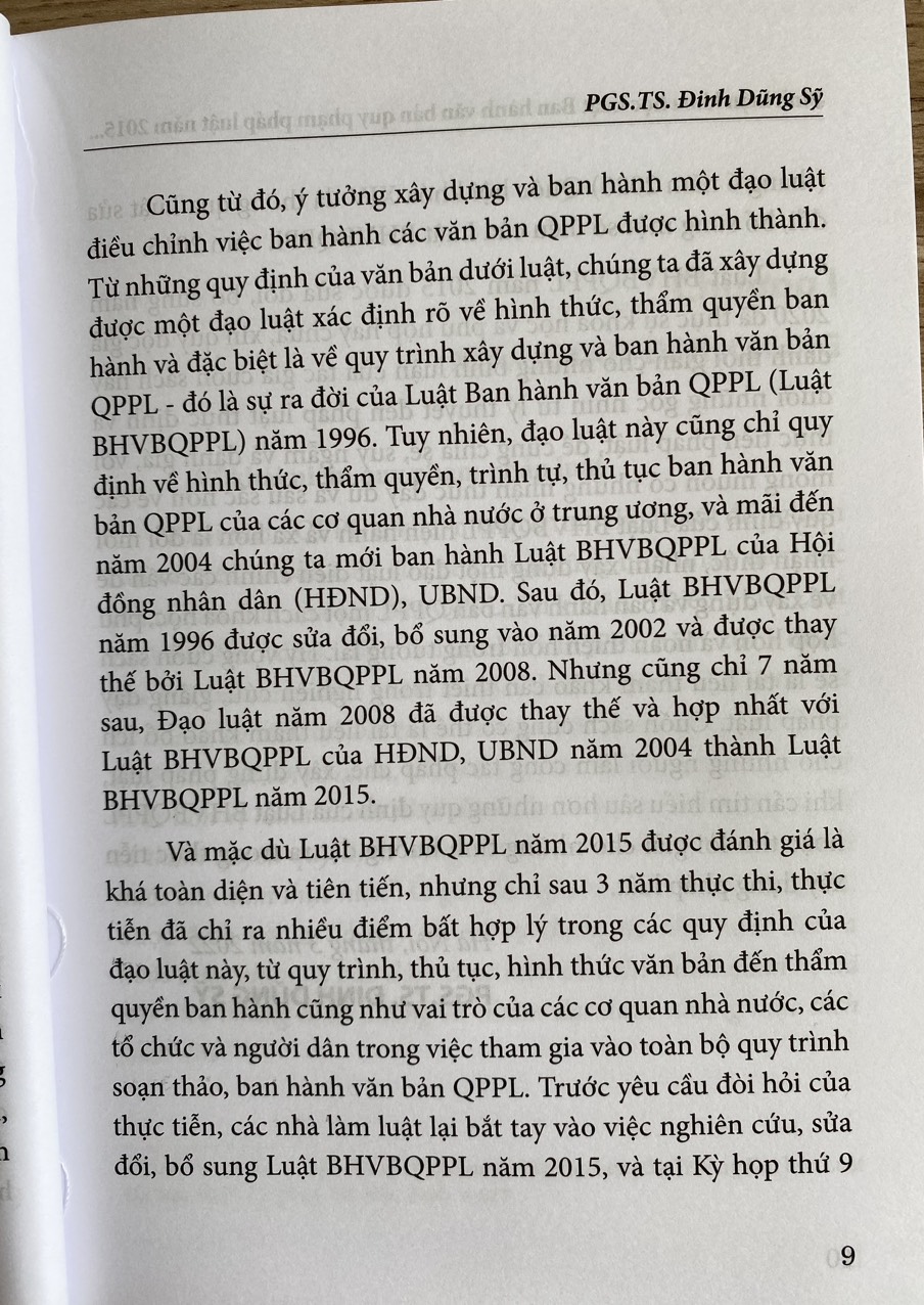 Tác giả: PGS.TS. Đinh Dũng Sỹ Ban hành văn bản quy phạm pháp luật là một hoạt động quan trọng trong việc xây dựng nhà nước pháp quyền. Thông qua hoạt động ban hành văn bản quy phạm pháp luật, những đường lối, chính sách phát triển mà Đảng, Nhà nước đề ra được thể chế hóa kịp thời, các quy tắc xử sự chung có giá trị trên thực tế, giúp bộ máy nhà nước được vận hành thống nhất và hiệu quả. Với tầm quan trọng đó, việc xây dựng, ban hành Luật Ban hành văn bản quy phạm pháp luật trở thành một nhu cầu cấp thiết được đặt ra. Năm 1996, Luật Ban hành văn bản quy phạm pháp luật lần đầu tiên được Quốc hội ban hành, qua nhiều lần sửa đổi, bổ sung, đến nay, Luật Ban hành văn bản quy phạm pháp luật năm 2015 (được sửa đổi, bổ sung năm 2020) đã dần hoàn thiện, phù hợp với thực tế. Để giúp bạn đọc tìm hiểu sâu hơn về đạo luật này, Nhà xuất bản giới thiệu cuốn “Bình luận khoa học Luật Ban hành văn bản quy phạm pháp luật năm 2015 (được sửa đổi, bổ sung năm 2020) - Lý thuyết, thực định và thực tiễn” của PGS.TS. Đinh Dũng Sỹ. Cuốn sách được viết dưới góc nhìn của một nhà nghiên cứu khoa học, đồng thời là người có kinh nghiệm trong công tác xây dựng, hoàn thiện hệ thống pháp luật tại Việt Nam Khác với những cuốn sách bình luận khác, trong cuốn sách này, thay bằng phân tích từng điều luật cụ thể, tác giả đã tiến hành bình luận, luận giải theo nhóm vấn đề. Cuốn sách phản ánh một góc nhìn mới, đa chiều của tác giả, đồng thời đưa ra các quan điểm mang tính gợi mở để tiếp tục nghiên cứu, hoàn thiện pháp luật. Dù tác giả đã dành sự tâm huyết và cố gắng trong quá trình biên soạn, nhưng cuốn sách khó tránh khỏi những thiếu sót nhất định.