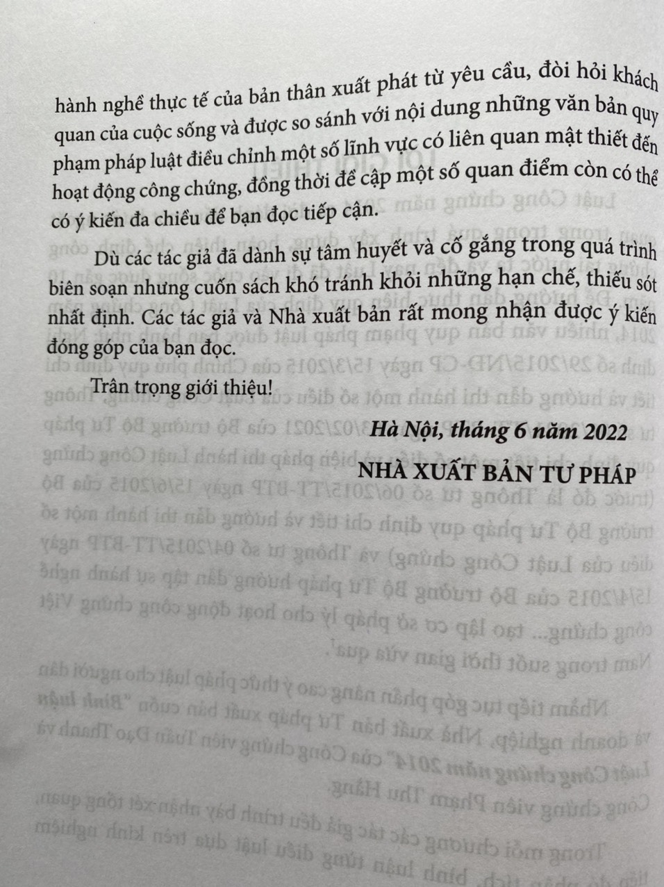 Bình Luận Luật Công Chứng Năm 2014 (tái bản lần thứ nhất) Tác giả: CCV. TUẤN ĐẠO THANH – CCV. PHẠM THU HẰNG Nhà phát hành: NXB Tư Pháp NXB: Tư Pháp Khổ sách: 16x24cm Số trang: 536 trang Phát hành: 1.2023   Luật Công chứng năm 2014 ra đời đánh dấu một bước ngoặc quan trọng trong quá trình xây dựng, hoàn thiện chế định công chứng tại nước ta và đến nay Luật đã đi vào cuộc sống được gần 10 năm. Để hướng dẫn thực hiện quy định của Luật Công chứng năm 2014, nhiều văn bản quy phạm pháp luật được ban hành như: Nghị định số 29/2015/NĐ-CP ngày 15/3/2015 của Chính phủ quy định chi tiết và hướng dẫn thi hành của một số điều của Luật Công chứng, Thông tư số 01/2021/TT-BTP ngày 03/02/2021 của Bộ trưởng Bộ Tư pháp quy định chi tiết một số điều và biện pháp thi hành Luật Công chứng (trước đó là Thông tư số 06/2015/TT-BTP ngày 15/6/2015 của Bộ trưởng Bộ Tư pháp quy định chi tiết và hướng dẫn thi hành một số điều của Luật Công chứng) và Thông tư số 04/2015/TT-BTP ngày 14/5/2015 của Bộ trưởng Bộ Tư pháp hướng dẫn tập sự hành nghề công chứng, tạo lập cơ sở pháp lý cho hoạt động công chứng Việt Nam trong suốt thời gian vừa qua. Nhằm tiếp tục góp phần nâng cao ý thức pháp luật cho người dân và doanh nghiệp, Nhà xuất bản Tư pháp xuất bản cuốn "Bình luận Luật Công chứng 2014" của Công chứng viên Tuấn Đạo Thanh và Công chứng viên Phạm Thu Hằng. Trong mỗi chương các tác giả đều trình bày nhận xét tổng quan, tiếp đó phân tích, bình luận từng điều luật dựa trên kinh nghiệm hành nghề thực tế của bản thân xuất phát từ yêu cầu, đòi hỏi khách quan của cuộc sống và được so sánh với nội dung những văn bản quy phạm pháp luật điều chỉnh một số lĩnh vực có liên quan mật thiết đến hoạt động công chứng, đồng thời đề cập một số quan điểm còn có thể có ý kiến đa chiều để bạn đọc tiếp cận. Dù các tác giả đã dành sự tâm huyết và cố gắng trong quá trình biên soạn nhưng cuốn sách khó tránh khỏi những hạn chế, thiếu sót nhất định. Các tác giả và Nhà xuất bản rất mong nhận được ý kiến đóng góp của bạn đọc. Trân trọng giới thiệu!