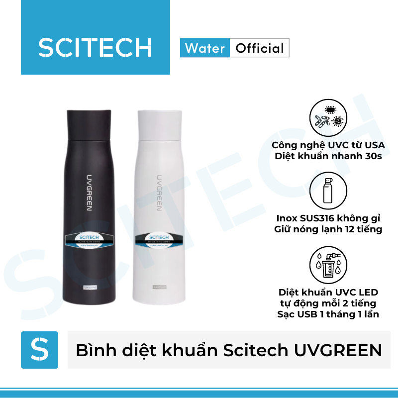 Mua tại TiktokBình nước giữ nhiệt diệt khuẩn Scitech UVGREEN 500ML là dòng bình nước giữ nhiệt kết hợp lọc diệt khuẩn bằng công nghệ UVC LED từ USA. Nước trong bình luôn đảm bảo sạch khuẩn và không có mùi hôi.