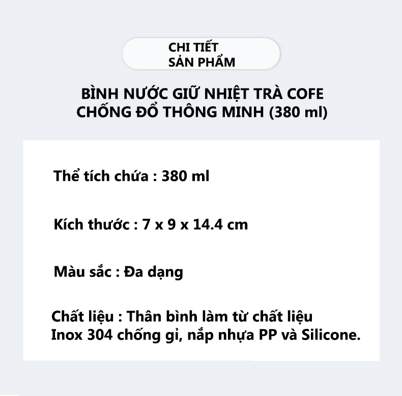 Bình Nước Giữ Nhiệt Trà Cafe Chống Đổ Thông Minh , Vỏ Nhựa , Chất Liệu Cách Nhiệt Inox 304 Cao Cấp , Kiểu Dáng Tinh Tế Năng Động ( 380ml ) CHI TIẾT SẢN PHẨM Dung tích: 380ml Chất liệu: Inox 304, nhựa PP và Silicone Chiều cao bình: 14.4 cm Màu sắc: Đen, Trắng, Xanh, Đỏ Giữ nhiệt ít nhất 6 tiếng Kiểu dáng thiết kế đơn giản, tinh tế, nhỏ gọn phù hợp cho học sinh, sinh viên, nhân viên văn phòng mang đi nhiều nơi Thiết kế bình đẹp mắt, tinh tế và chất liệu giữ nhiệt đảm bảo an toàn sức khỏe cho người sử dụng
