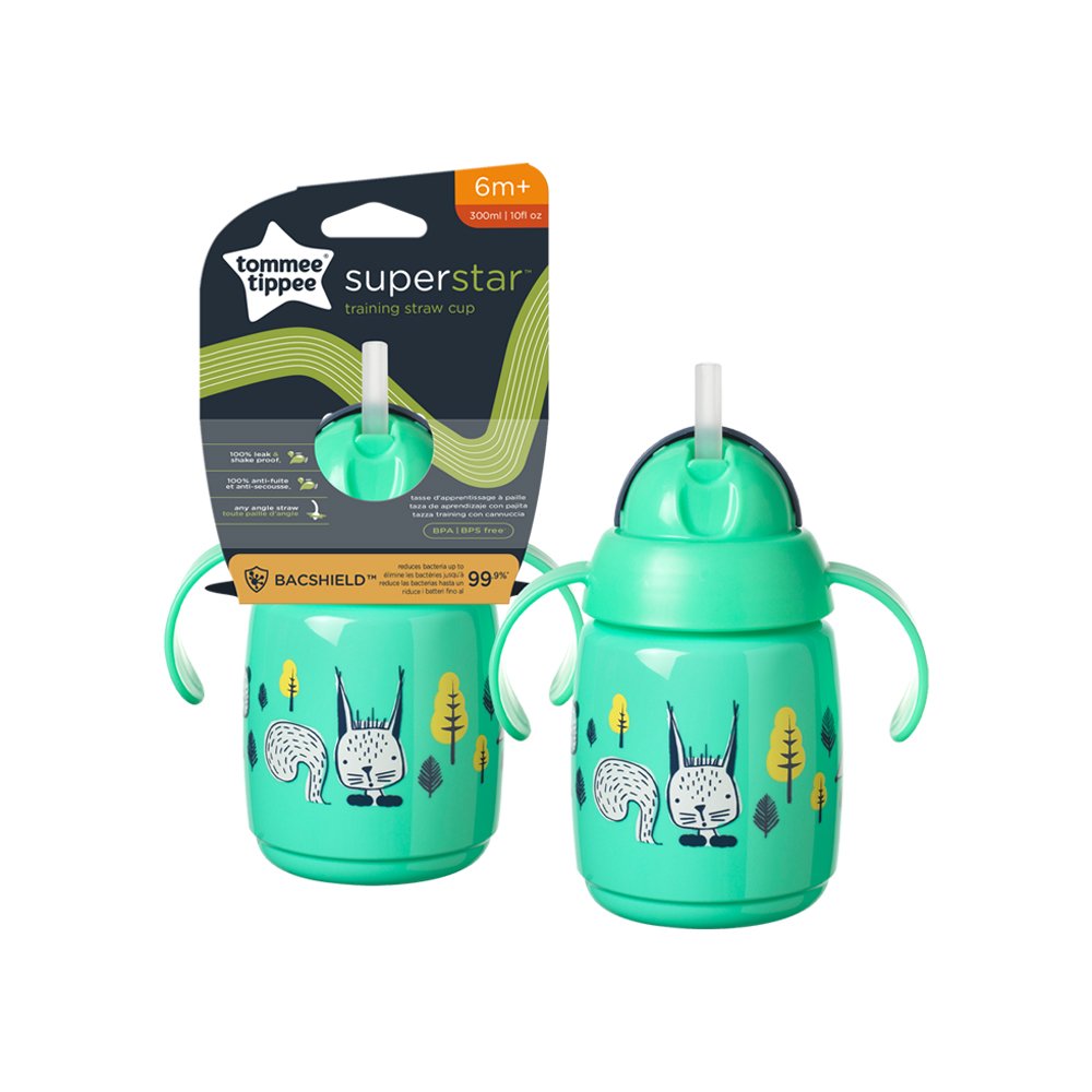 ✨Bình Tập Uống Nước Có Ống Hút Đáy Nặng Kháng Khuẩn Chống Tràn Cho Bé Tommee Tippee Superstar 300ml, Từ 6 Tháng - Xanh Lá