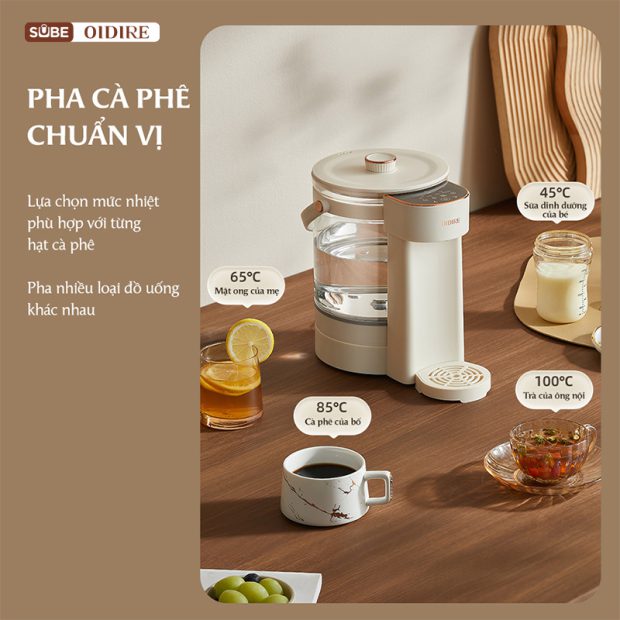 Bình thủy điện OIDIRE được thiết lập sẵn 4 chức năng ưu việt: đun nóng – khử Clo – pha cà phê – giữ ấm, giúp các mẹ pha sữa chuẩn nhiệt độ nhanh chóng.