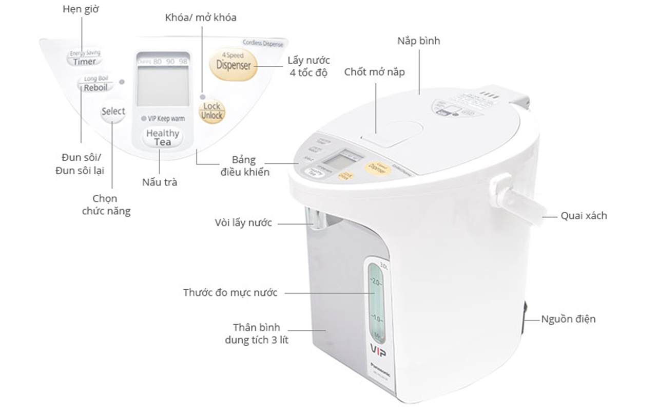 Thiết kế thông minh Sản phẩm được thiết kế với chế độ tự động, bạn chỉ cần đổ nước và cắm công tắc, bình thủy điện Panasonic sẽ lo mọi việc còn lại, giúp tiết