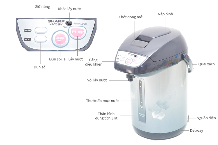Thiết kế hiện đại Bình Thủy Điện Sharp KP-Y32PV có thiết kế hiện đại và sang trọng, với những hoa văn tinh tế, trang nhã, dễ dàng hòa hợp với điều kiện nội thất của không gian bếp nhà bạn. Đun sôi hiệu quả Dung tích 3 lít và khả năng đun sôi nước nhanh với công suất 700W, giúp bạn tiết kiệm được thời gian và có thể sử dụng nước nóng trong thời gian ngắn. Khả năng giữ ấm Bình thủy điện có khả năng giữ ấm ở nhiệt độ lên đến 90 và nút chức năng đun sôi lại khi châm thêm nước hoặc chưa đạt được nhiệt độ như ý muốn, đáp ứng được nhu cầu sử dụng nước nóng thường xuyên và liên tục, nhất là khi nhà có trẻ nhỏ hay người già. An toàn khi sử dụng Sản phẩm được trang bị tính năng khóa bơm nước khi không sử dụng và rơ-le tự ngắt khi nước sôi hay không có nước. NGoài ra thiết kế thân bình gồm lớp trong bằng inox không gỉ và lớp ngoài bằng nhựa cao cấp nên cách nhiệt tốt. Ruột bình chống bám cặn và không bị oxy hóa giữ cho nước luôn sạch nên tốt cho sức khỏe.
