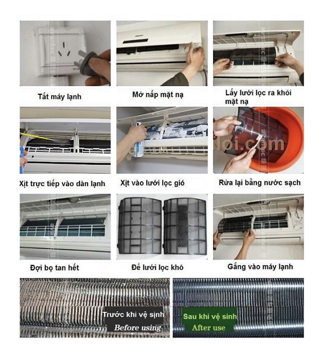 - Mở mặt trước của mặt lạnh điều hòa, tháo tấm lưới lọc bụi ra rửa sạch bằng nước, kết hợp với dùng bàn chải mềm để làm sạch các khe, rãnh, góc cạnh sau đó dùng chai xịt lên toàn bộ bề mặt dàn lạnh ở khoảng cách khoảng 5cm.
