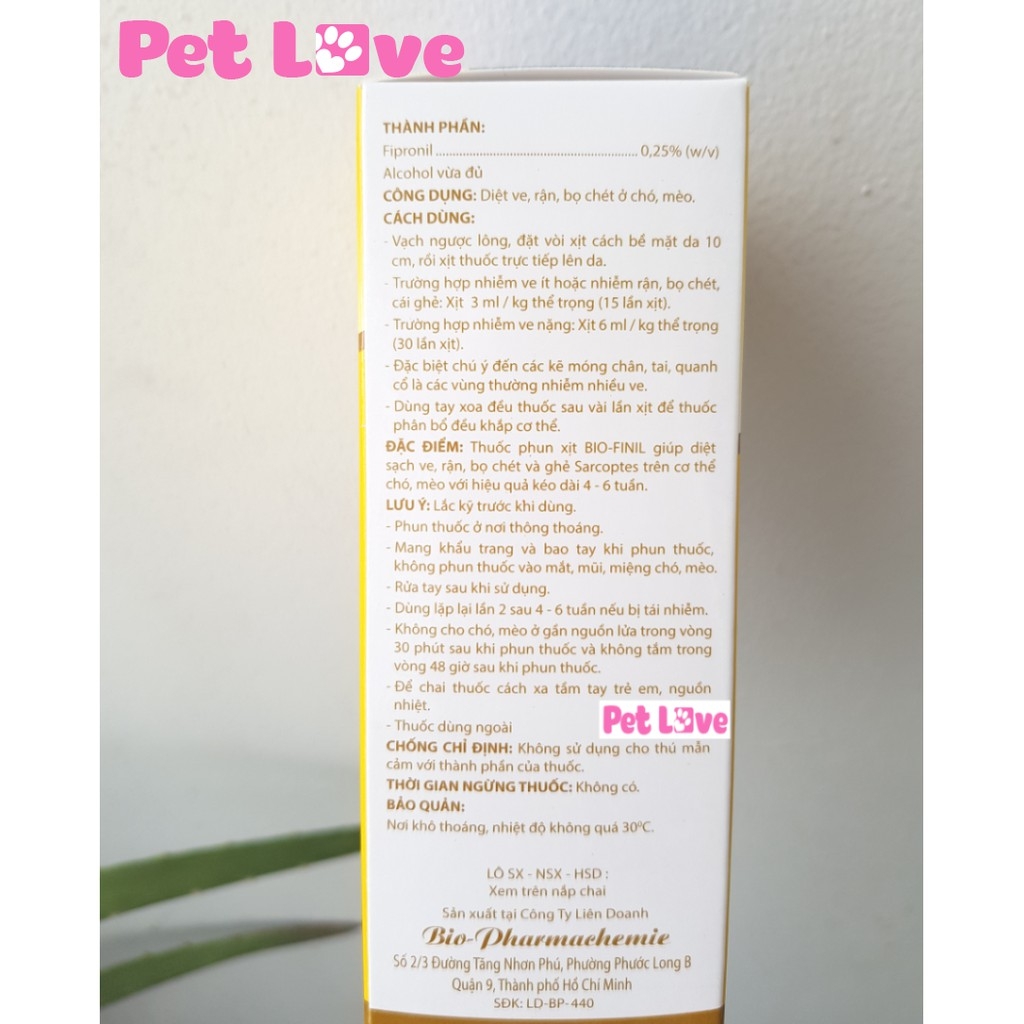- Thuốc Phun Xịt Ve, Ghẻ, Bọ Chét Chó Mèo Bio Finil (100ml) giúp diệt sạch ve, rận, bọ chét và ghẻ Sarcoptes trên cơ thể chó, mèo với hiệu quả kéo dài 4-6 tuần.