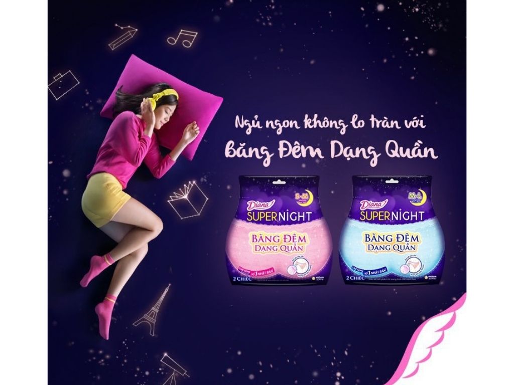 Diana SENSI Băng Đêm Dạng Quần với đột phá “2 trong 1”: Kết hợp Thiết kế quần lót nhỏ gọn vừa vặn với cơ thể cùng Cấu trúc băng đêm bảo vệ an toàn khiến người mặc thoải mái trong mọi tư thế ngủ, chẳng còn lo tràn băng.