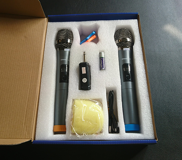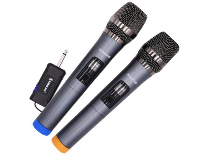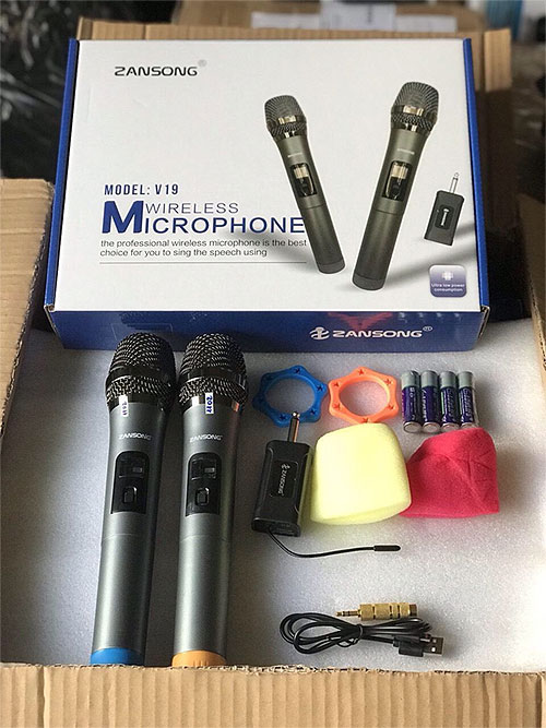 Công tắc On/Off nằm giữa thân micro Phím điều khiển On/Off được bố trí ngay giữa thân micro có màn led hiển thị tần số mic rất đẹp ( hình trên) , chỉ cần gạt tay lên xuống là có thể tắt bật âm thanh, rất tiện lợi. Dùng cho nhiều mục đích khác nhau Microphone không dây Zangsong V19 có thể dùng để hát karaoke, nói chuyện trong nhà, trên sân khấu và ngay cả ngoài trời. Phụ kiện di theo bộ mic gồm: 2 Micro, 1 bộ thu phát tín hiệu, 1 cab sạc, 2 đôi pin A, 1 đầu cắm chuyển đổi tặng thêm bông lọc âm và đế chống lăn.