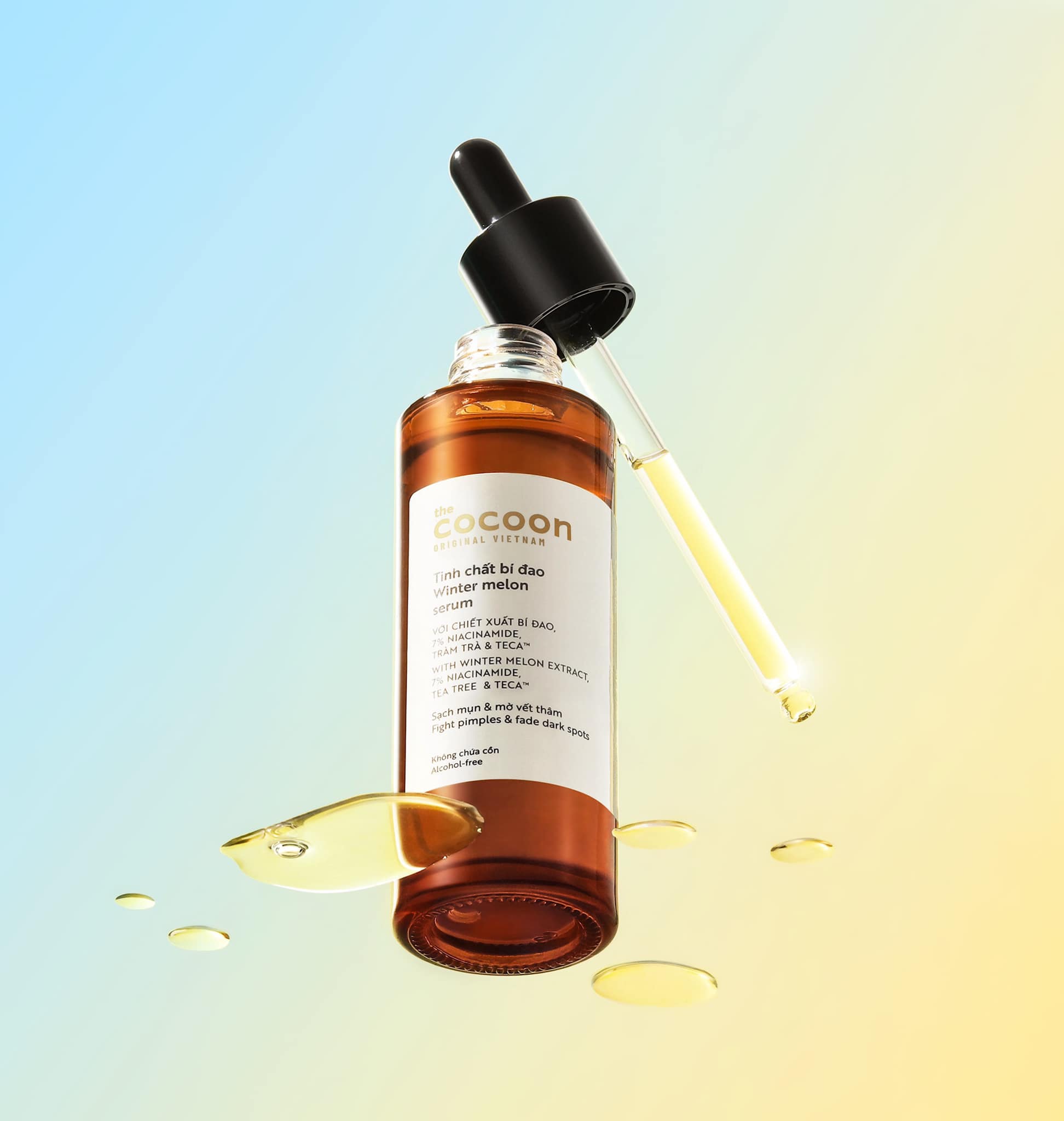 GEL RỬA MẶT BÍ ĐAO COCOON Dung tích: 140ml Làm sạch mụn, bụi bẩn, dầu thừa TONER NƯỚC CÂN BẰNG DA BÍ ĐAO COCOON Dung tích: 140ml Cân bằng pH, Làm dịu cà cấp ẩm nhanh. TINH CHẤT BI ĐAO (SERUM) Dung tích: 70ml Cung cấp dưỡng chất phục hồi da, Cải thiện tình trạng mụn ẩn. Làm mờ vết thâm Cam kết từ COCOON