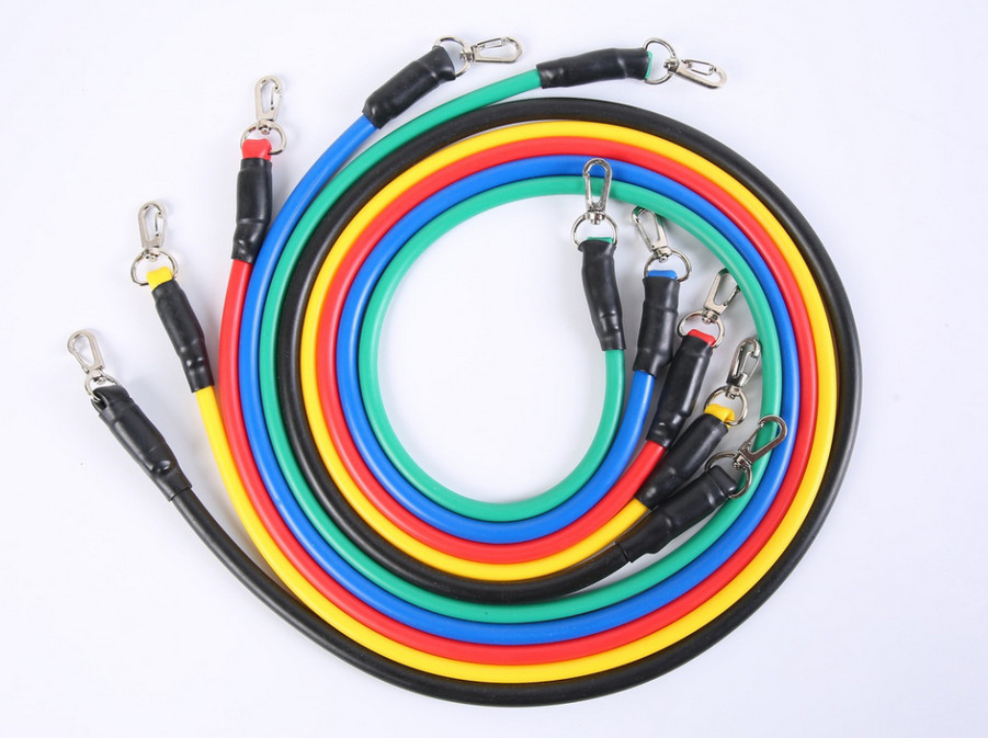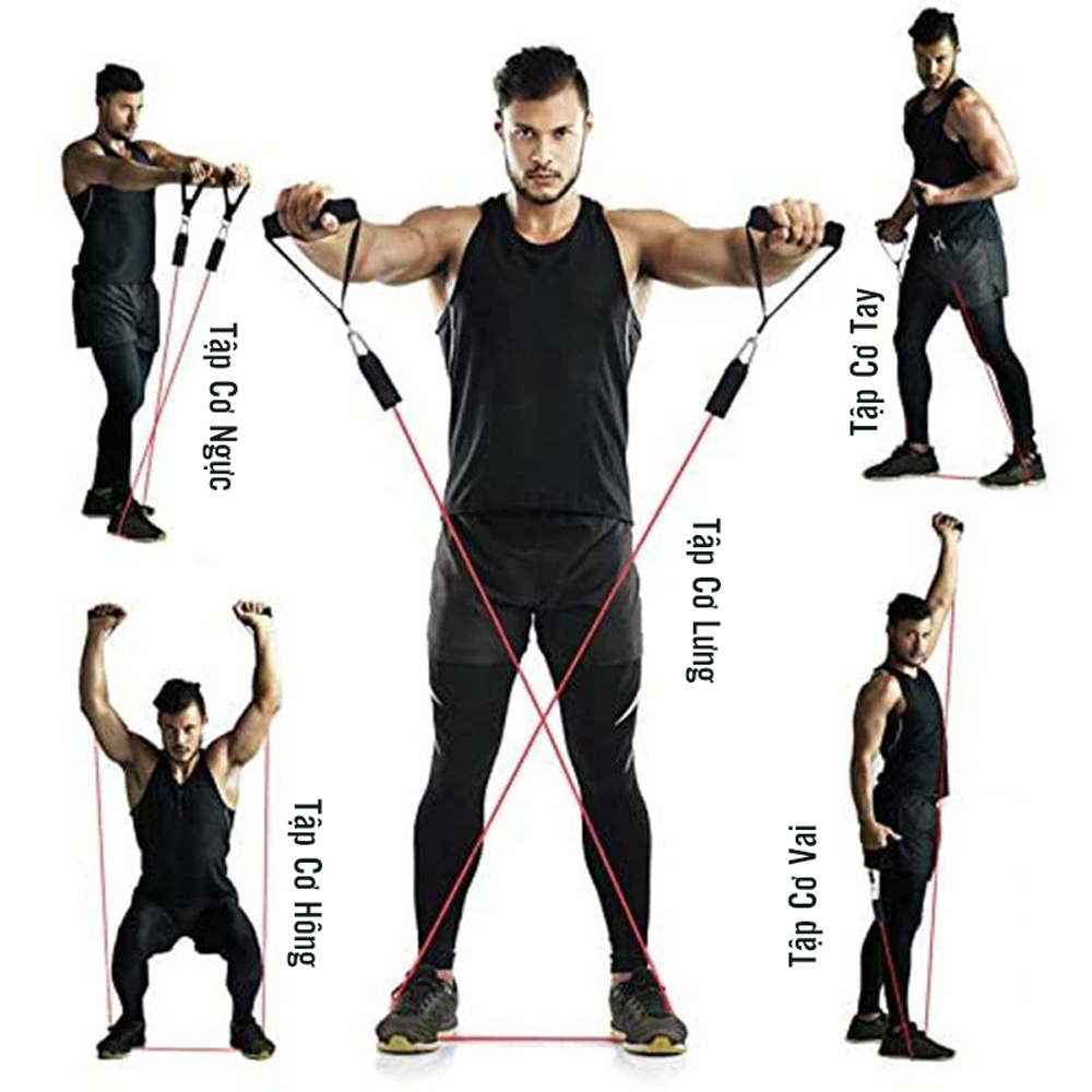 Bộ dây đàn hồi tập thể lực có 5 dây, mỗi dây có mức trọng lượng khác nhau, từ nhẹ tới nặng (8 lbs, 15 lbs, 20 lbs, 25 lbs, 30 lbs) có thể