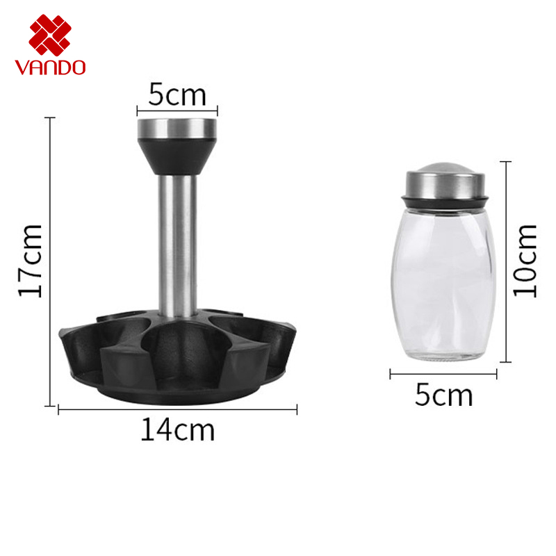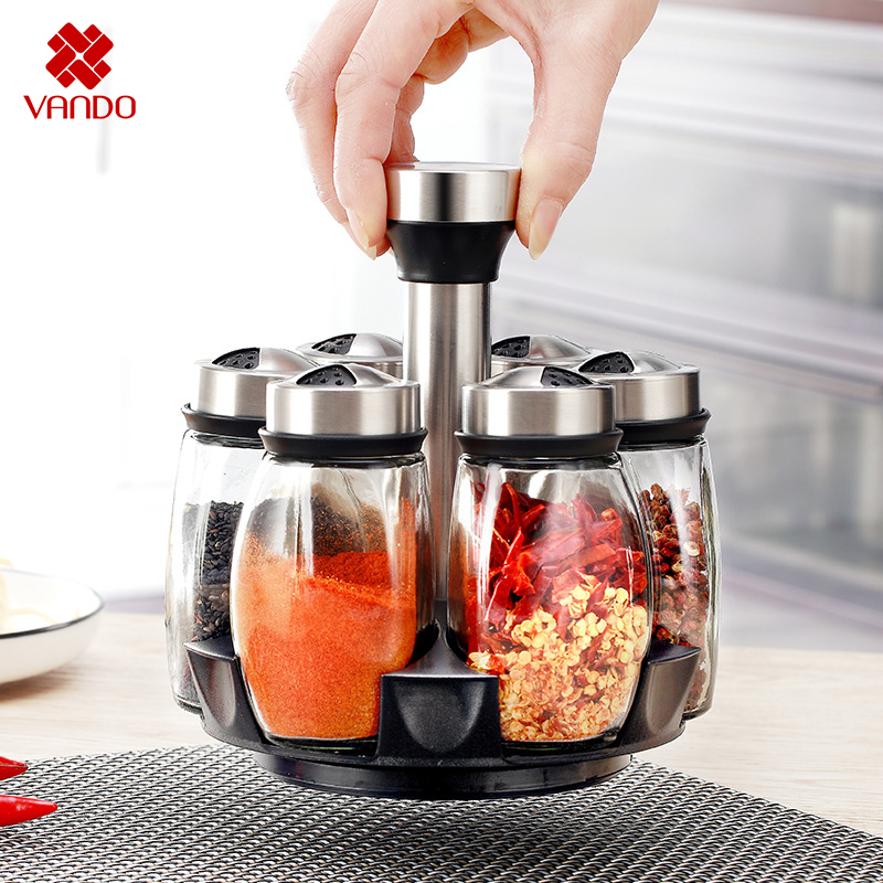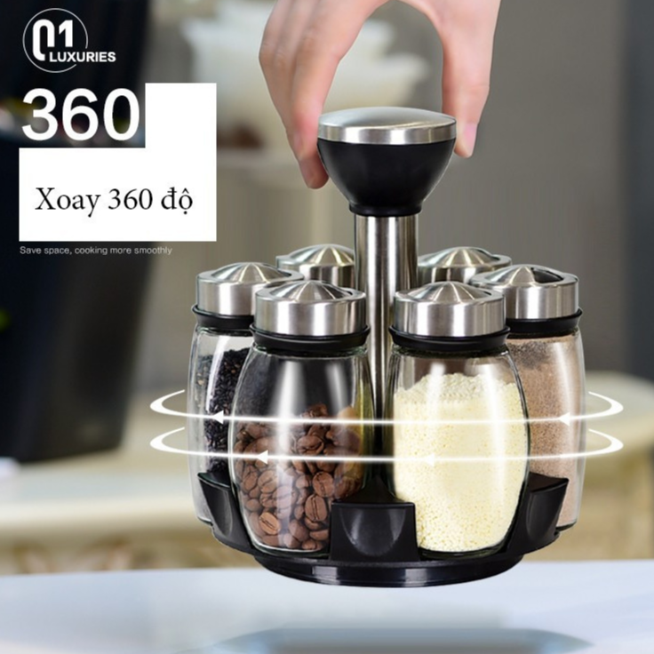 Bộ 6 lọ thủy tinh đựng gia vị kèm giá xoay 360 độ được làm bằng thủy tinh sáng bóng, thân thiện với môi trường và an toàn khi sử dụng.