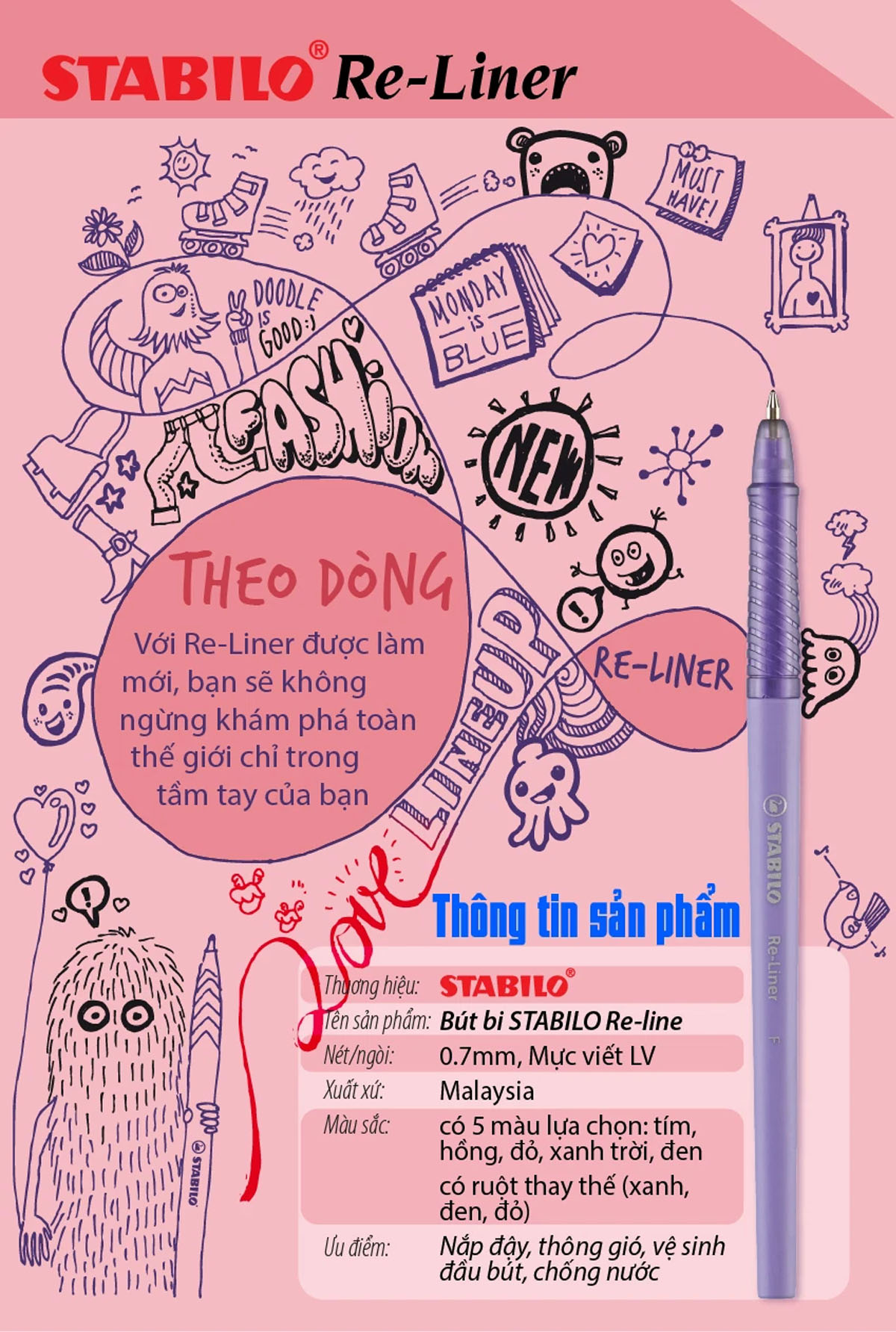 - Mực khó phai, thấm nước không nhòe - Đầu bi 0,7mm làm bằng hợp kim bền chắc - Tay cầm có các vân chống trơn trượt - Xuất sứ: Malaysia