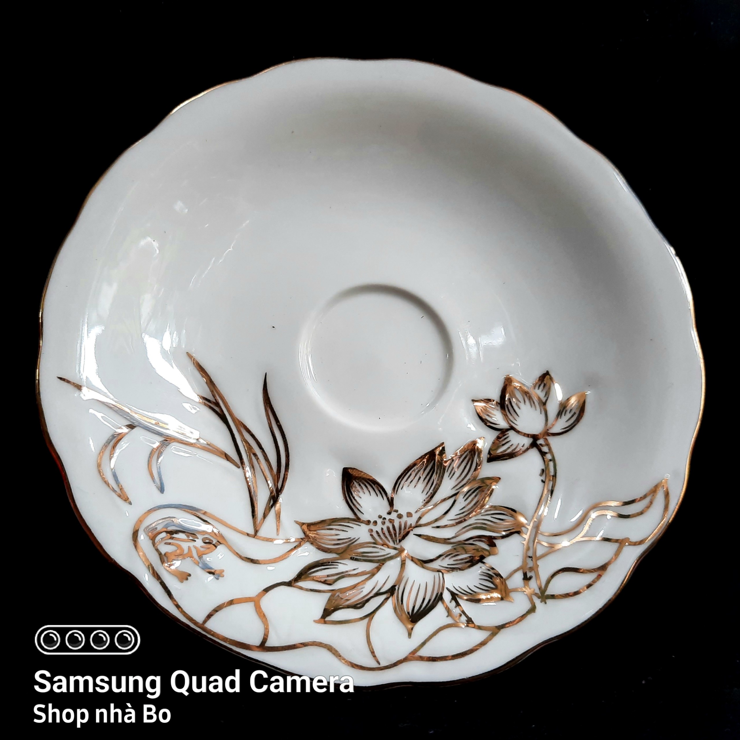 • 07 Đĩa kê đường kính 13cm                     Đặc điểm nổi bật: Bộ ấm chén Bát Tràng cao cấp mẫu đơn đỏ vẽ sen vàng