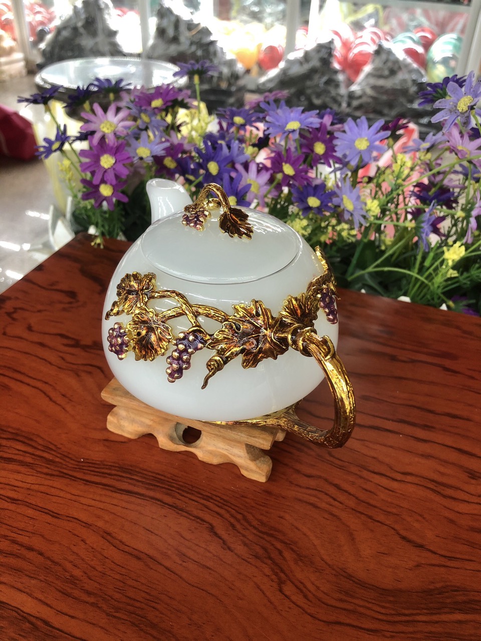 ✨Bộ ấm trà chạm cây nho tím với ly chạm chữ đá bạch ngọc