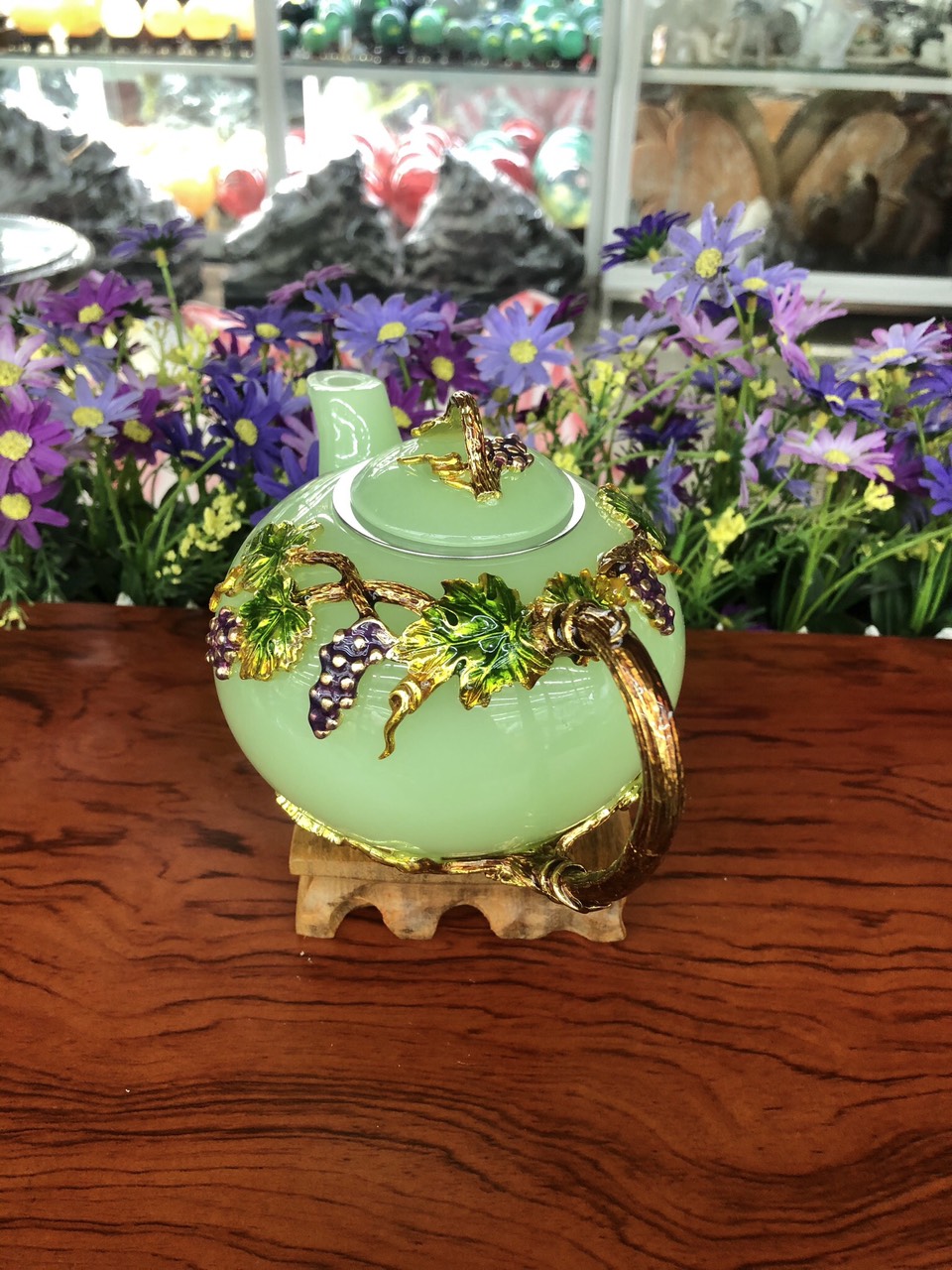 ✨Bộ ấm trà chạm cây nho tím với ly chạm chữ đá ngọc cẩm thạch xanh