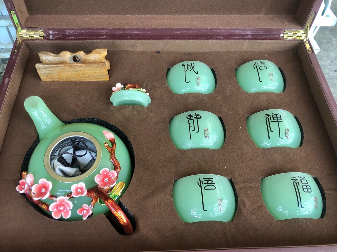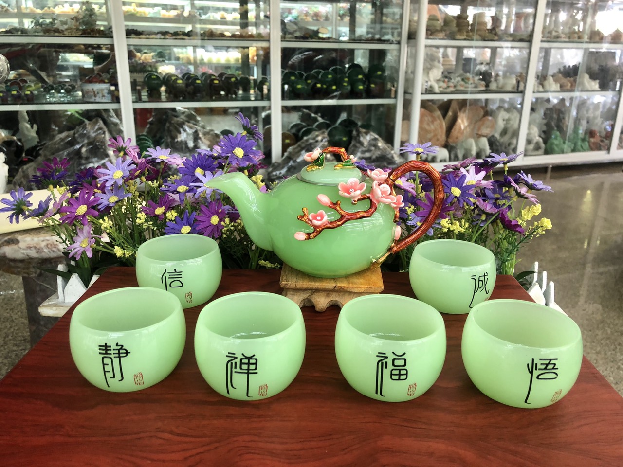 ✨Bộ ấm trà chạm hoa mai đá ngọc cẩm thạch xanh