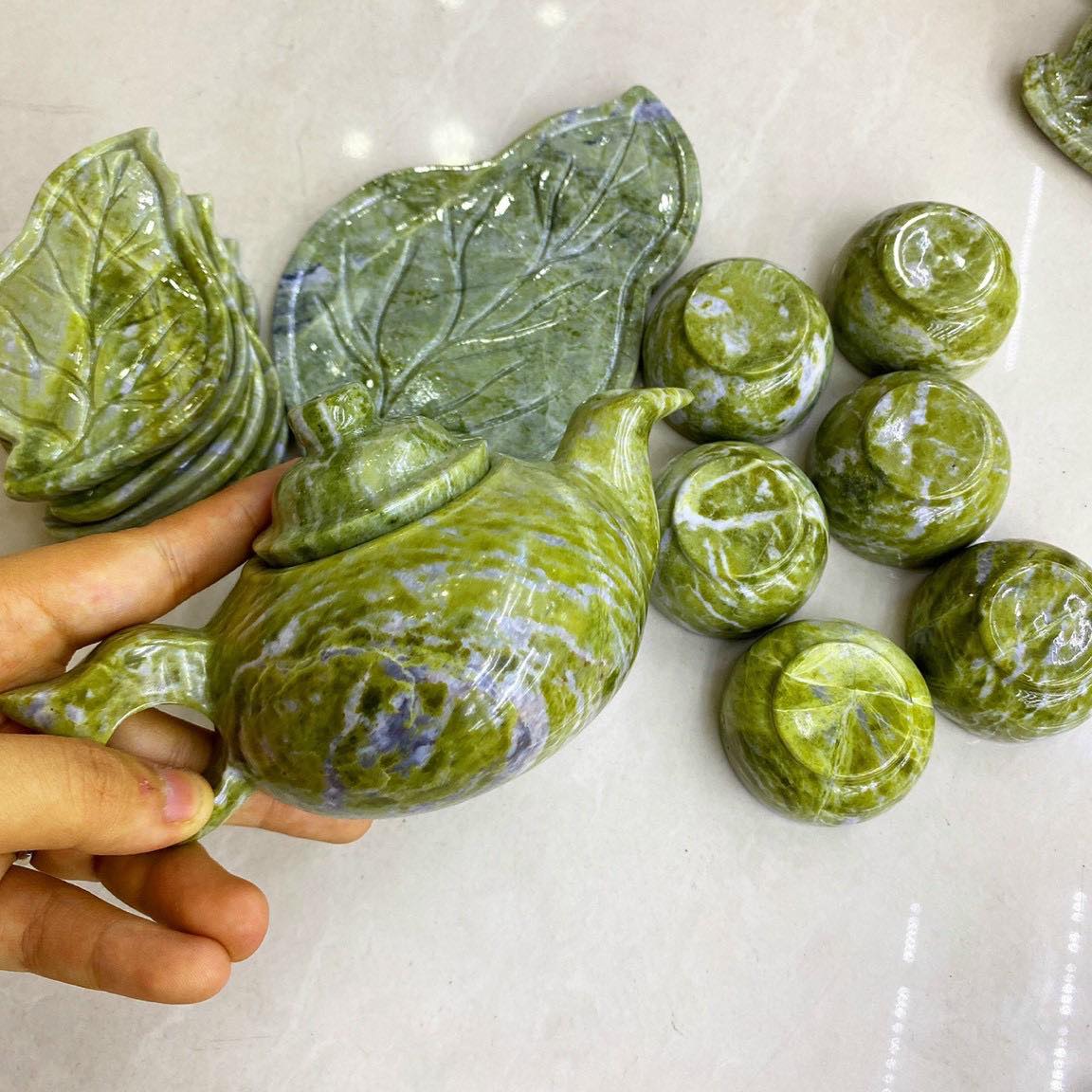 ✨Bộ ấm trà với dĩa hình chiếc lá đá ngọc serpentine