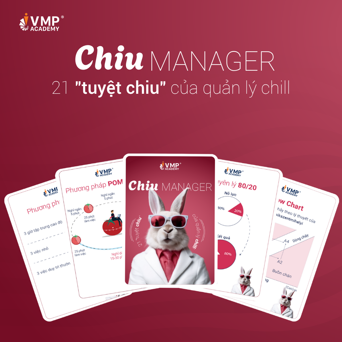 Chiu Manager – Bộ bài quản lý đơn giản, dễ nhớ, dễ dùng Bạn đang tìm kiếm một công cụ đào tạo quản lý: Không lý thuyết dàn trải – Chỉ tập trung vào hành động? Chiu Manager là bộ công cụ do VMP Academy phát hành, thiết kế dành riêng cho các nhà quản lý bận rộn. Với 21 thẻ bài trực quan, bộ card giúp bạn áp dụng ngay các mô hình quản lý nền tảng như Pomodoro, Eisenhower, Kanban, GROW, Tuckman... vào công việc hằng ngày. Ai nên dùng bộ công cụ này?