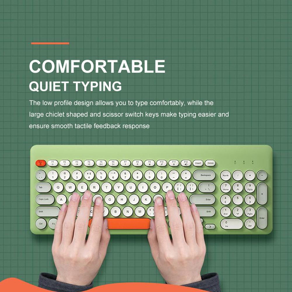Features: 2.4G wireless connection,96keys,multimedia shortcuts design meet your daily office needs. Punk round keycapsdesignfitsyourfingersand brings you comfortable typing experience. Ergonomic design,tilt angle design of folding stand effectively release your pressure of neck and shoulder and