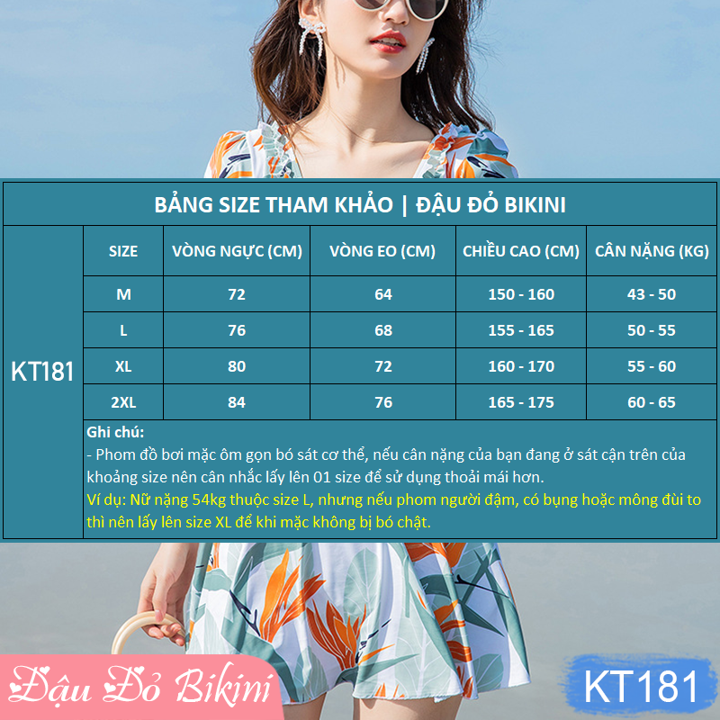 - Size Nữ (tùy chiều cao): One Size cho cân nặng từ 38-50Kg - Màu chủ đạo: Nhiều màu và mẫu theo lựa chọn của khách hàng. - Thiết kế hai mảnh, có sẵn mút