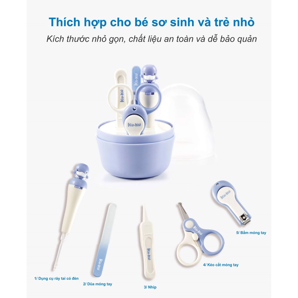 Mua tại TiktokĐặc điểm nổi bật Bộ sản phẩm KUKU với đầy đủ các vật dụng cần thiết, tiện dụng cho Mẹ chăm sóc cho bé : 1 kéo cắt móng tay, 1 bấm móng tay, 1 dũa móng tay, 1 dụng cụ ráy tai có đèn và 1 nhíp