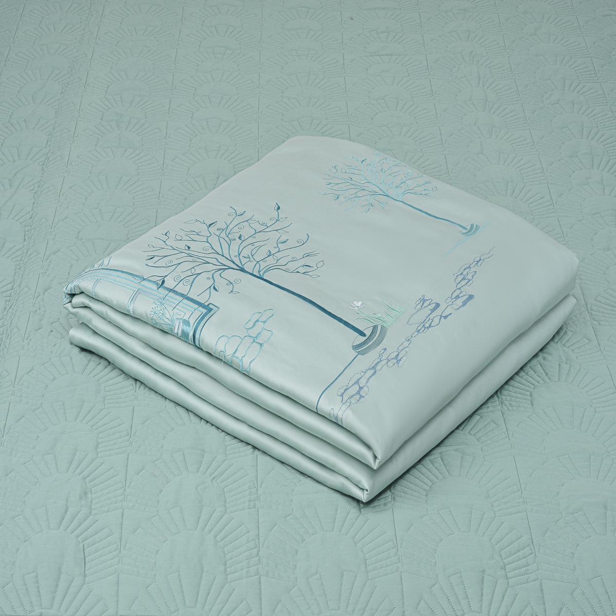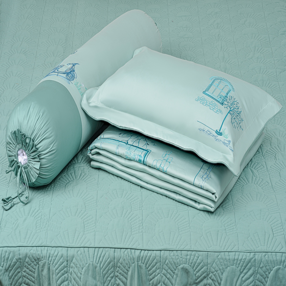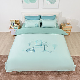 Tô điểm cho phòng ngủ thêm sang trọng, hiện đại Bộ Drap & Chăn Chần Lụa Tencel Bee House F002 có màu xanh dương tươi mát gồm 5 món: 1 drap bọc 1.6 x 2 m/