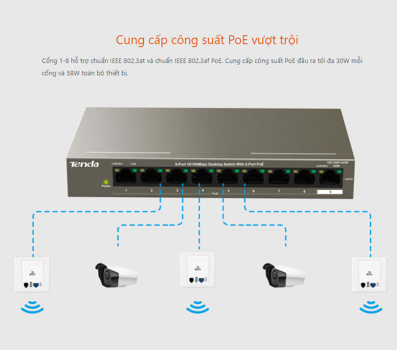Hỗ trợ chuẩn IEEE 802.3at PoE Bộ Chia Mạng 8 Cổng PoE Tenda TEF1110P 10 Port 2 cổng chuyển mạch PoE gigabit dành cho máy tính để bàn được Tenda phát triển. Nó cung cấp