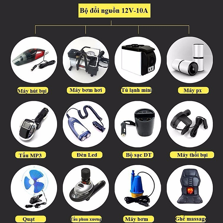 Bộ đổi nguồn từ 220V sang 12V-10A-120W giúp bạn sử dụng các thiết bị 12v đã đầu tư trên xe ô tô nay muốn sử dụng tại nhà, hoặc các thiết bị sử dụng điện 12v có dòng lớn sảm phẩm thiết kế đầu ra dạng cắm tẩu trên ô tô.