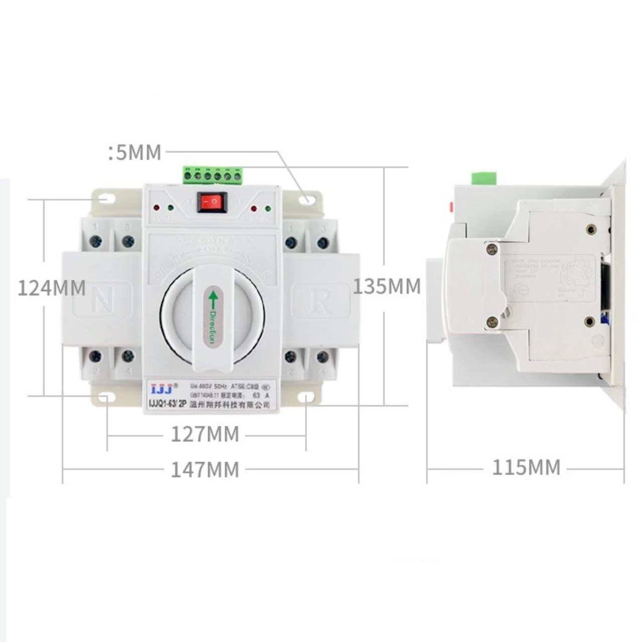 - Chuyển nguồn điện tự động theo số ngày cài đặt trước bằng cách sử dụng thêm công tắc hẹn giờ (dùng để hẹn ngày chuyển từ dùng công tơ 1 sang dùng công tơ 2 và ngược lại) + contactor 63A + bộ ATS 63A-2P. – Sản phẩm ATS 125A-2P cấu tạo đơn giản dễ dàng lắp đặt và sử dụng. Các thao tác tiến hành hoàn toàn tự động an toàn không phải thao tác nguy hiểm như khi sử dụng cầu dao đảo chiều * Thông số kỹ thuật Bộ chuyển đổi nguồn điện tự động ATS 125A-2P 1pha – Điện áp sử dụng: 220V-50/60HZ – Thời gian chuyển: < 2s – Dòng điện cho phép tối đa: 63A. – Có thể sử dụng ATS125A-2P tự động hoặc thủ công: + Nhấn nút điền khiển trên đầu thiết bị về Automatic (tự động), công tắc sẽ chuyển về Normal power (điện lưới) hoặc Reverse power(điện dự phòng) một cách tự động + Nhấn nút về Manual (thông thường), người sử dụng sẽ phải tự chuyển Direction(nguồn điện) bằng tay. – Chú ý: Nguồn sẽ bị gián đoạn khi chuyển mạch – Có thể lắp dọc hoặc ngang – Kích thước thiết bị: rộng x dài x cao = 150x138x115(mm)