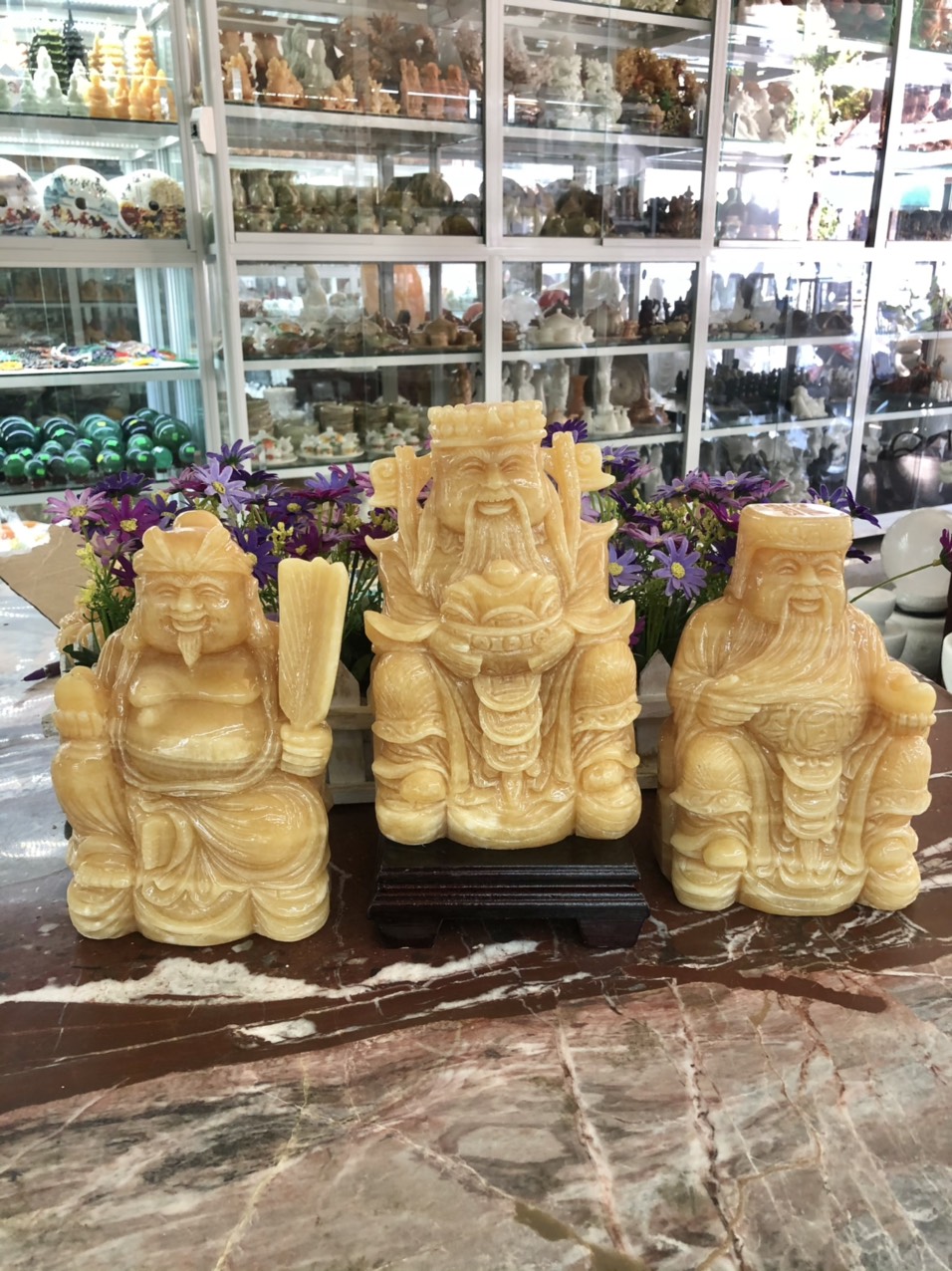 Chất liệu: Đá ngọc hoàng long Kích thước: Dài 15 cm x Rộng 10 cm x Cao 20 cm Khối lượng: 4,4 kg Thần Tài là vị thần trông coi tiền tài, vàng bạc, mang
