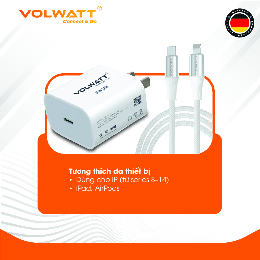 Bộ củ cáp Volwatt GE-30-SCL 30W GaN là lựa chọn hoàn hảo cho người dùng muốn sạc nhanh – an toàn – bền bỉ cho các thiết bị cổng L và Type-C.